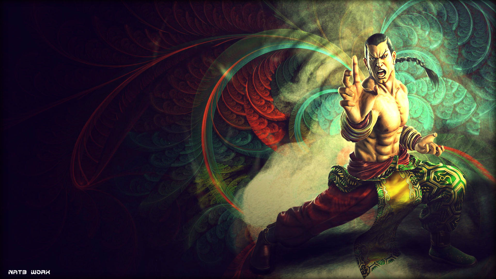 Description: A man with a sword in his hand and a bird in the background with a swirly pattern on it.