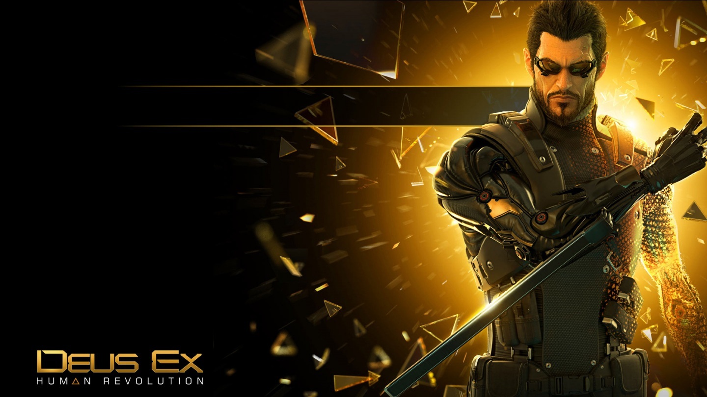 Description: A man holding a sword in front of a black background with gold and black triangles and a black background.