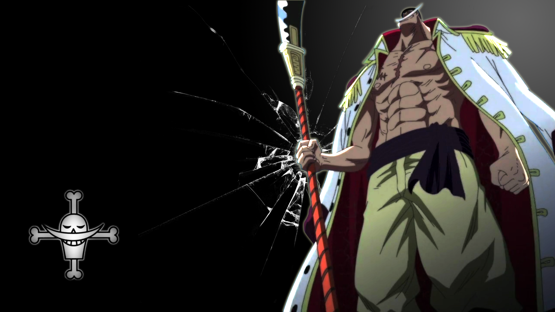 Description: A man holding a sword and a broken glass window in front of him with a skull on the side.
