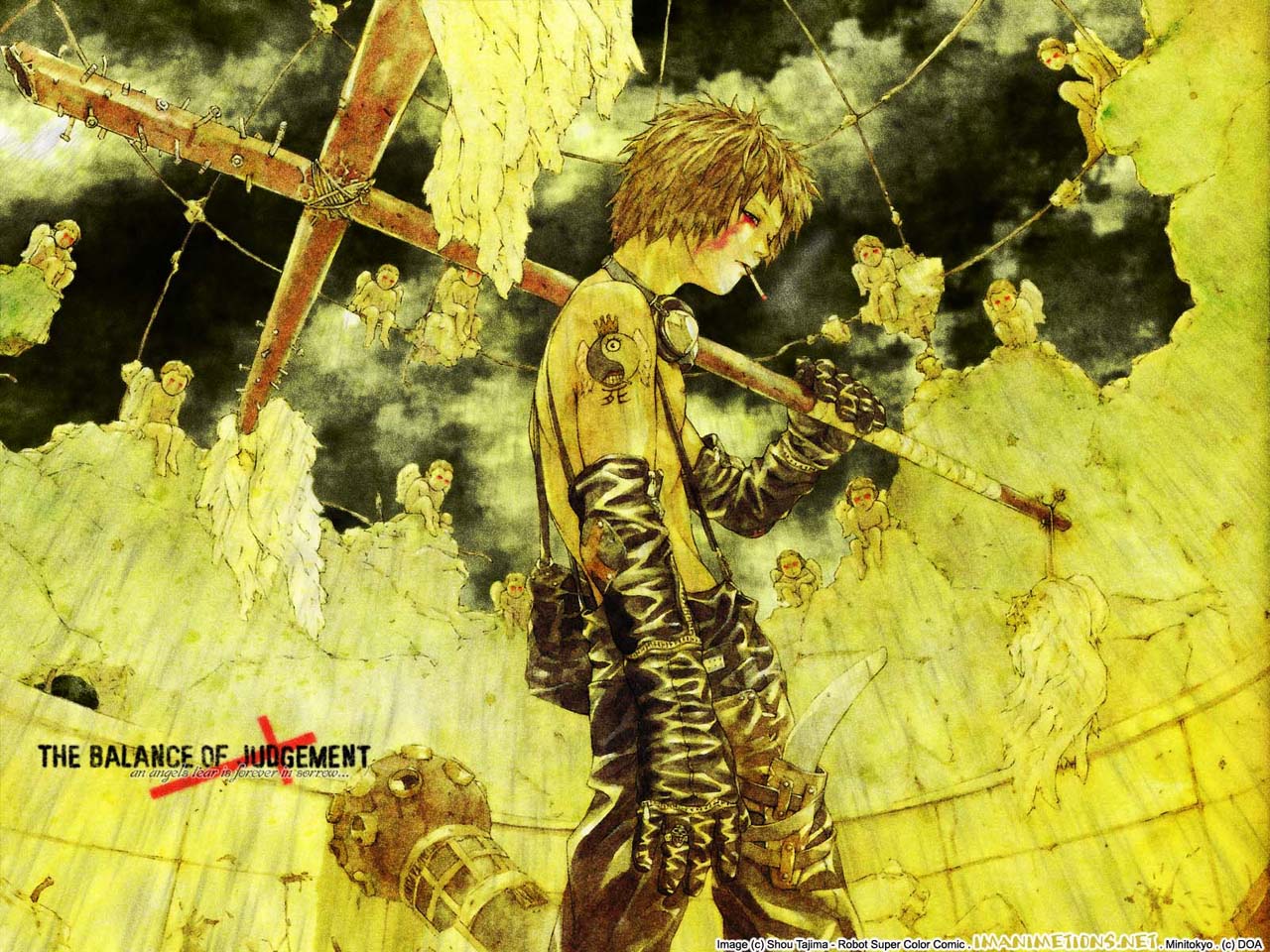 Description: A man with a sword standing in front of a cross and angels in the sky behind him.