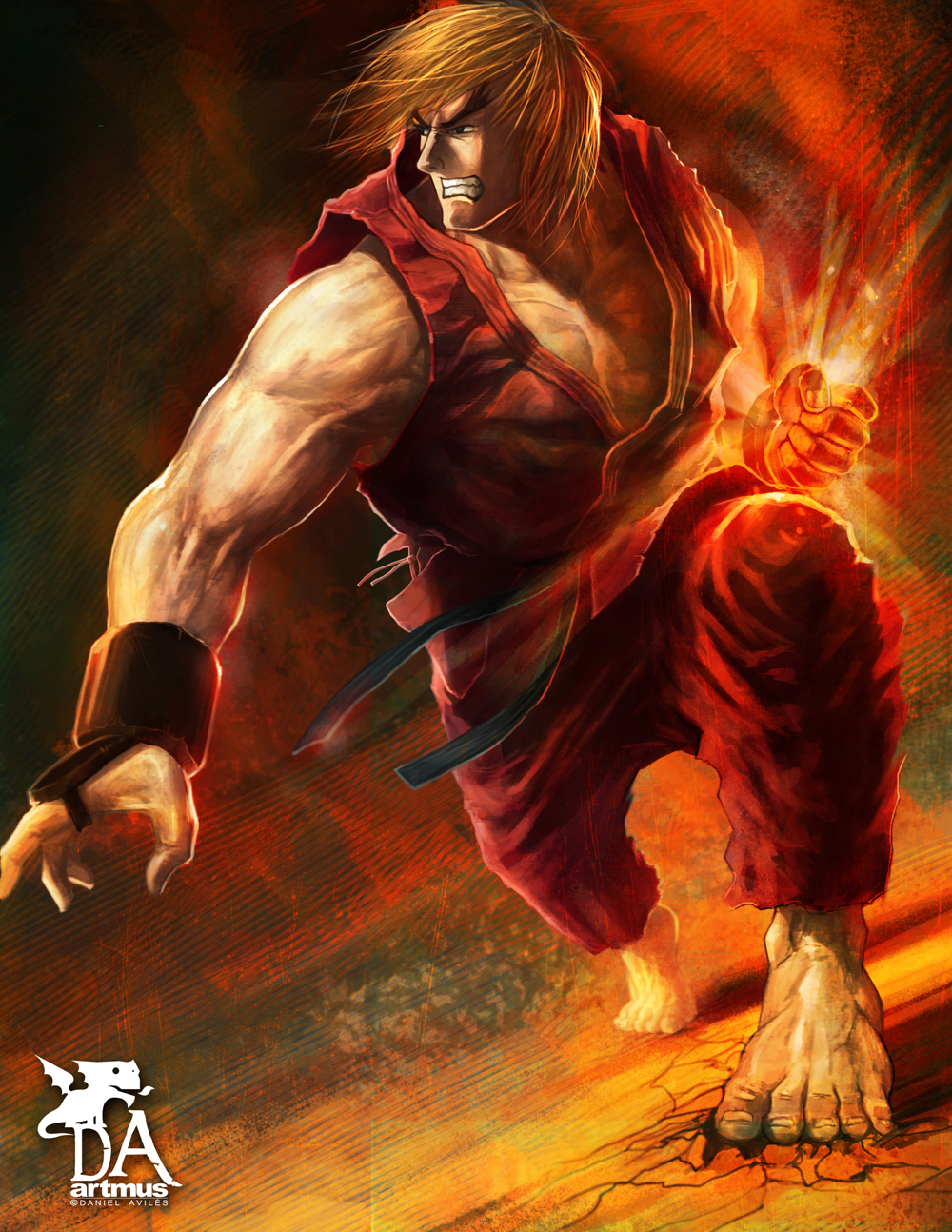 Description: A man with a sword in his hand and a demon in the background with a demon on his arm.