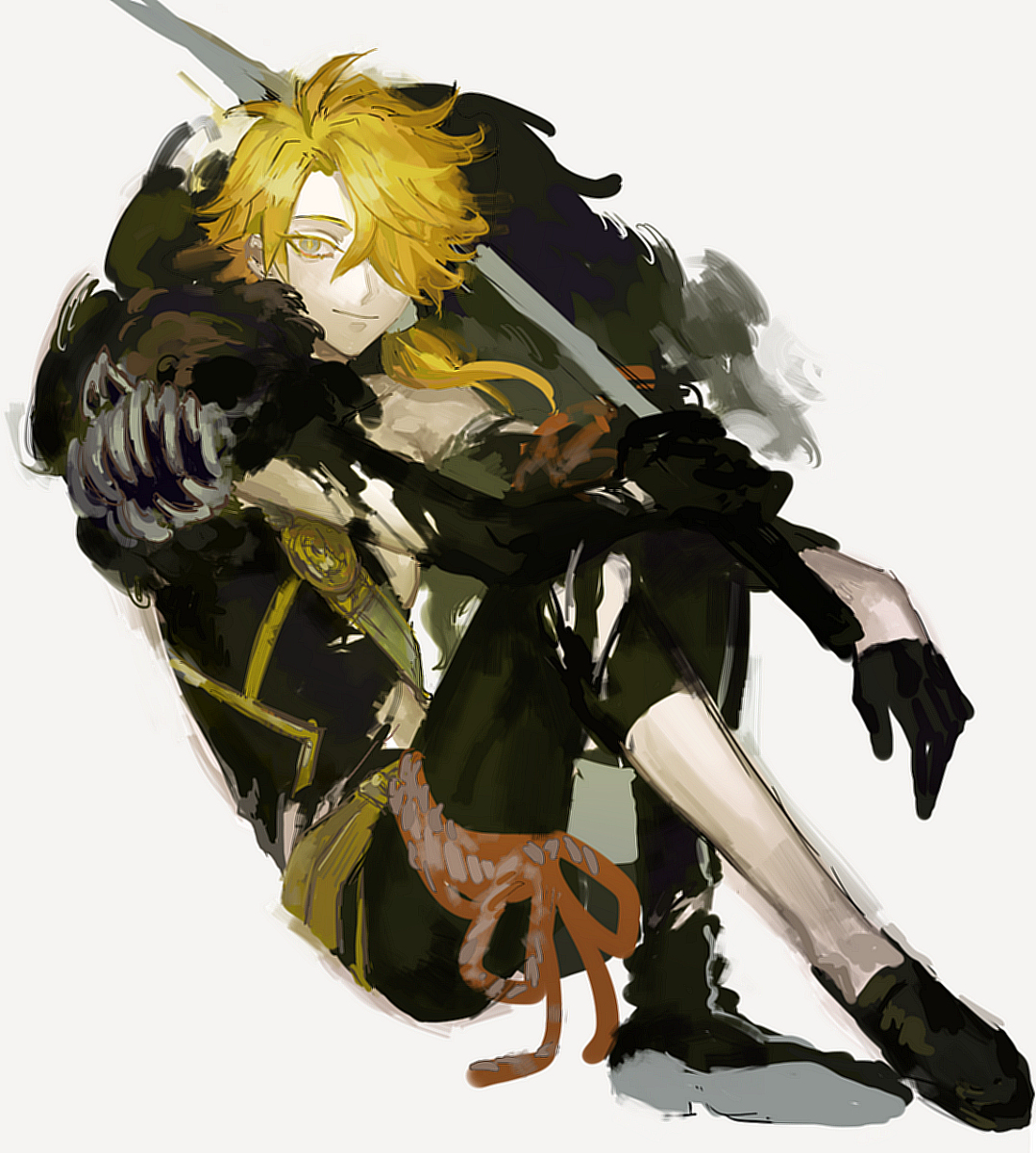 Description: A drawing of a man with a sword and a demon outfit on sitting down with a demon on his knee.