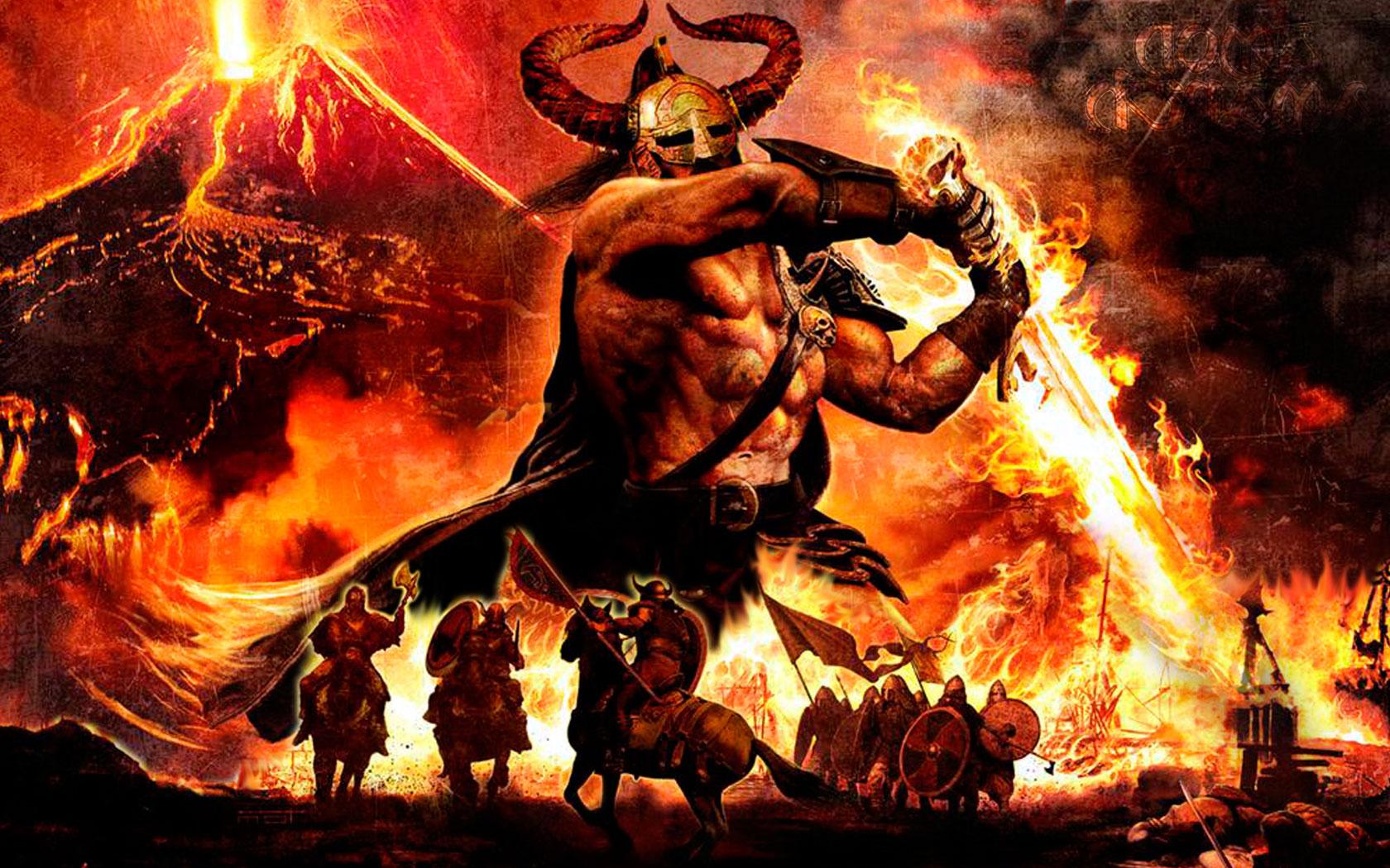 Description: A man with a sword in front of a fire filled mountain with other men standing around him and a demon on his back.