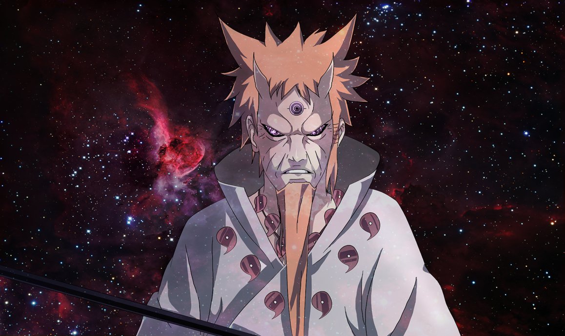 Description: A man with a sword in front of a galaxy background with stars and a star cluster in the background.