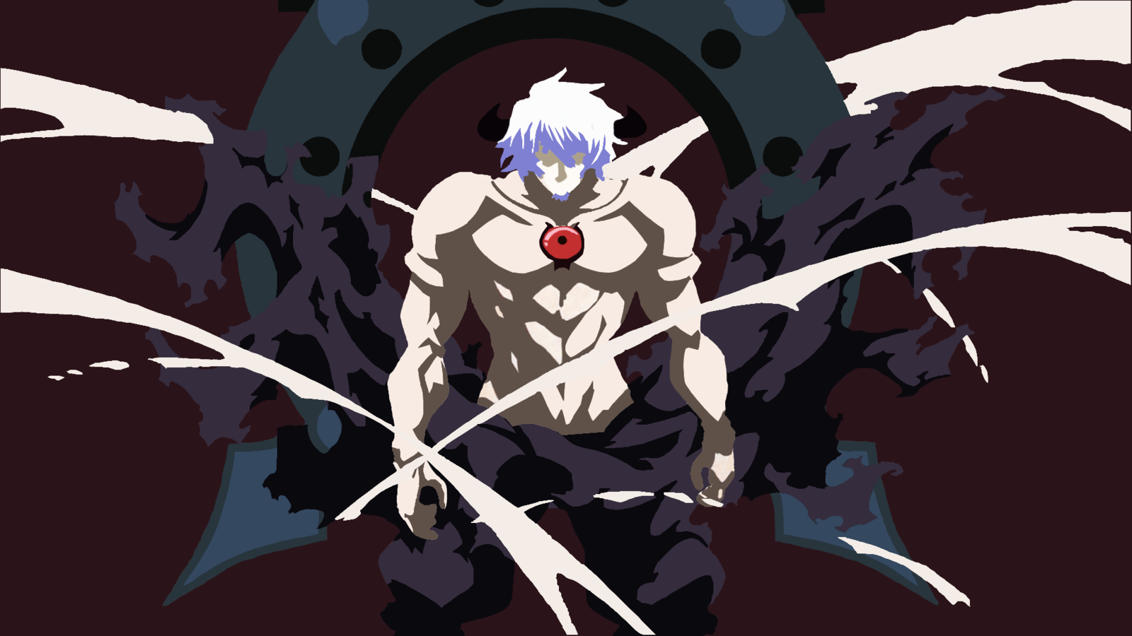 Description: A man with a sword standing in front of a giant object with wings around him and a red eye.