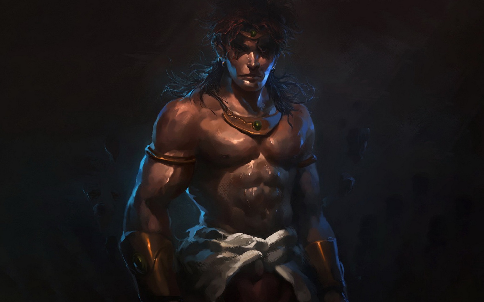 Description: A man with a sword and a body with a lot of hair and a beard and a collar around his neck.