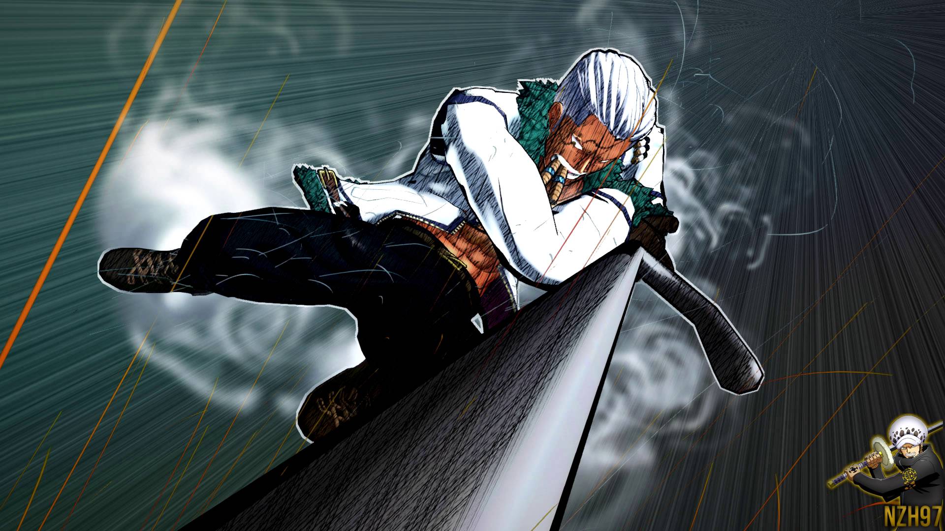 Description: A man with a sword is leaning on a pole and smoking a cigarette in his mouth and a man with a white shirt and black pants.