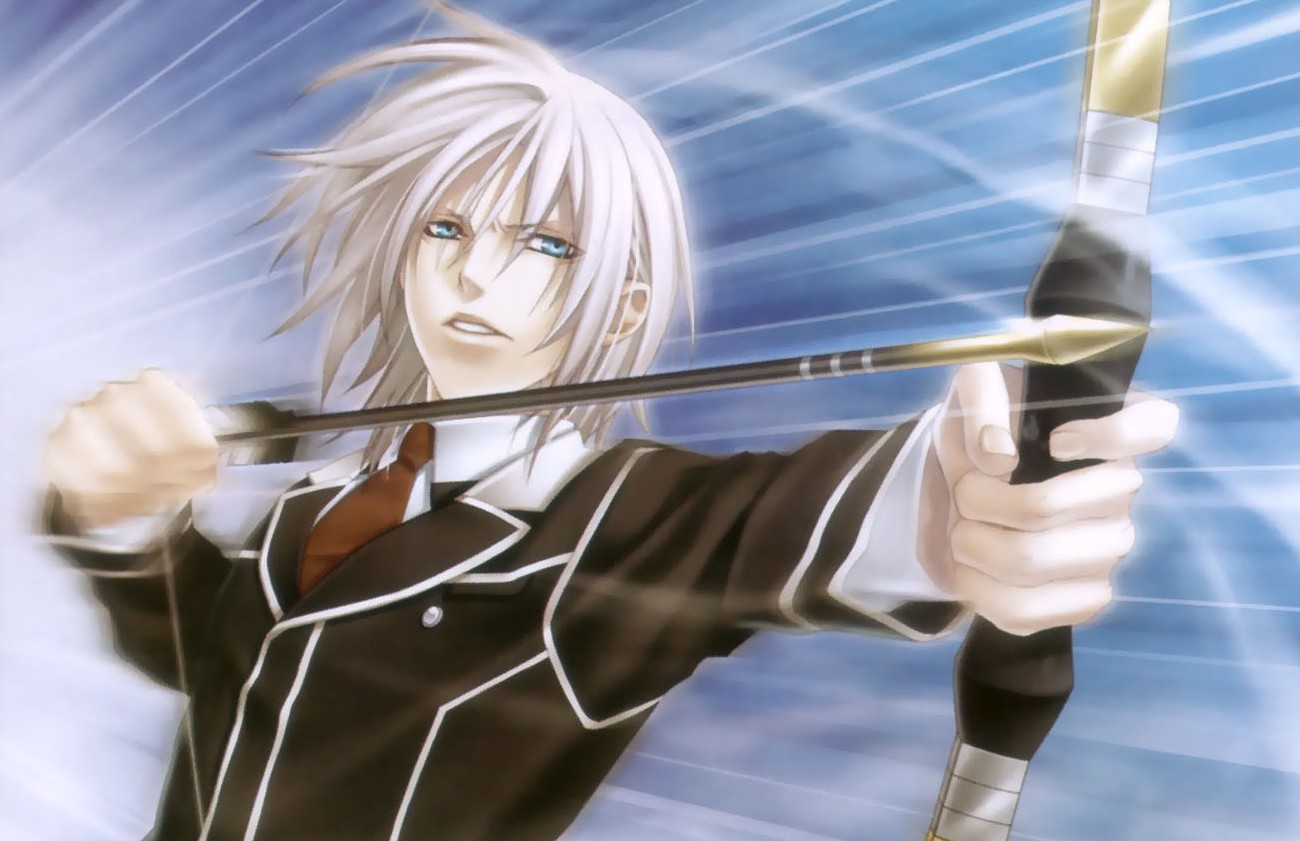 Description: A man holding a sword and pointing it at the camera with a blue sky in the background and a white haired man in a black shirt.