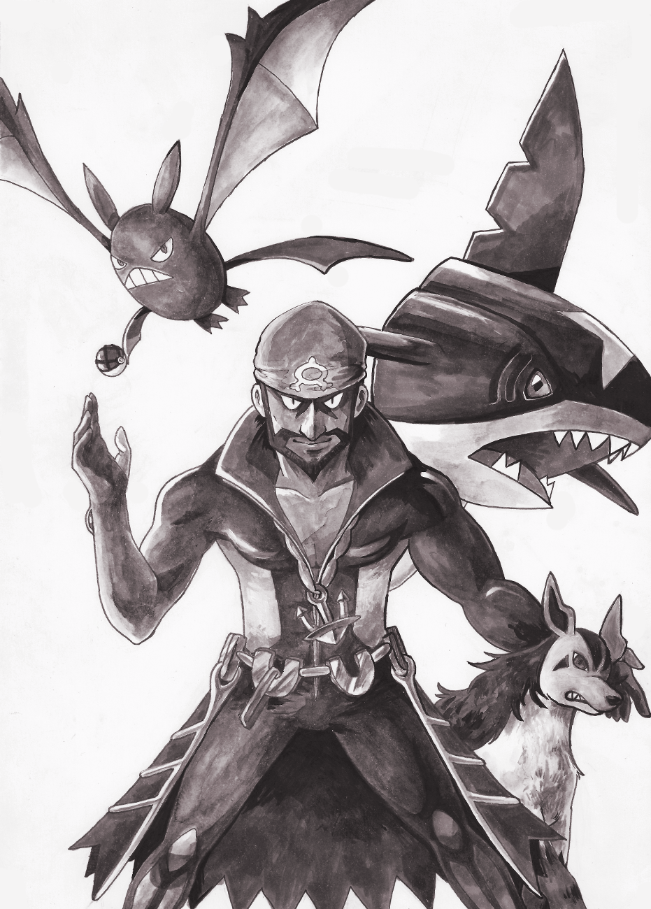 Description: A drawing of a man with a sword and a shark on his back and a dog on his back.