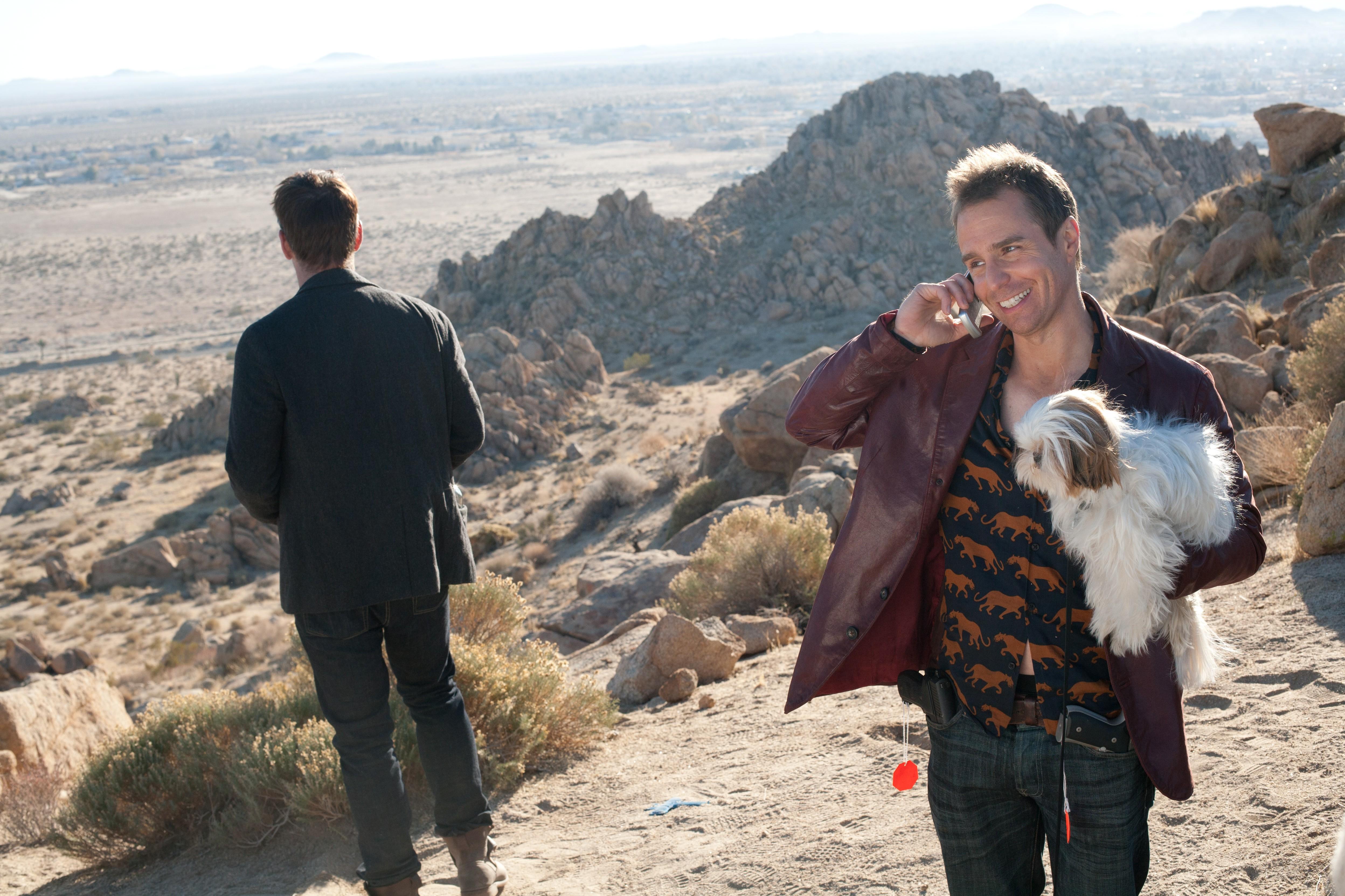 Description: A man talking on a cell phone while holding a dog in his lap and a man walking on a hill.