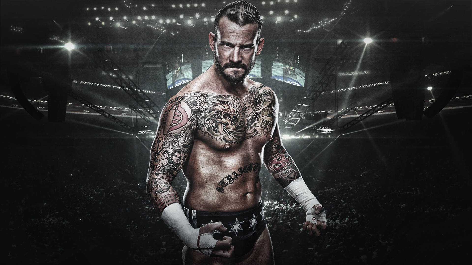 Description: A man with a tattoo on his chest and a ring around his neck standing in a stadium with a crowd.