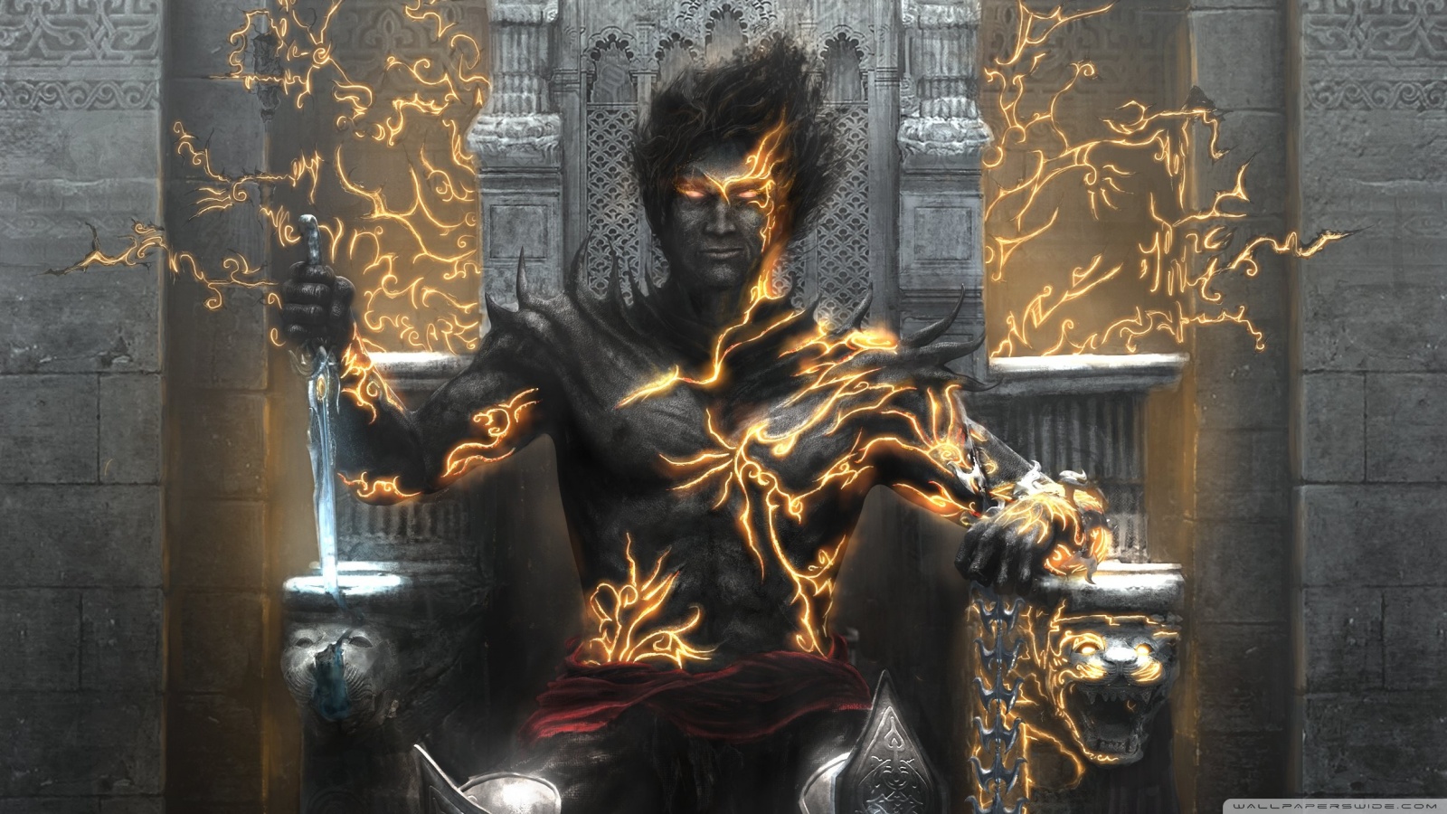 Description: A man sitting on a throne with a sword in his hand and a fire in his mouth on his arm.