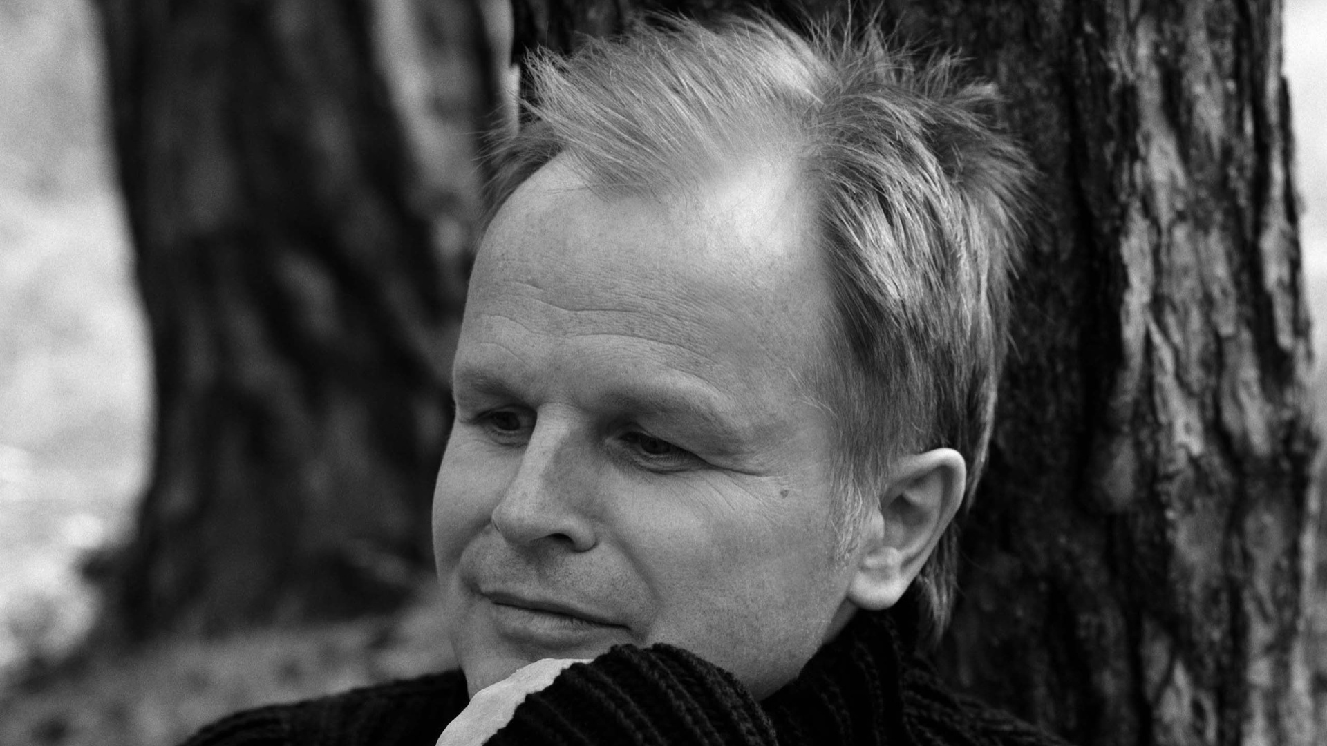Description: A man with a tie around his neck standing next to a tree in a forest with a tree trunk.