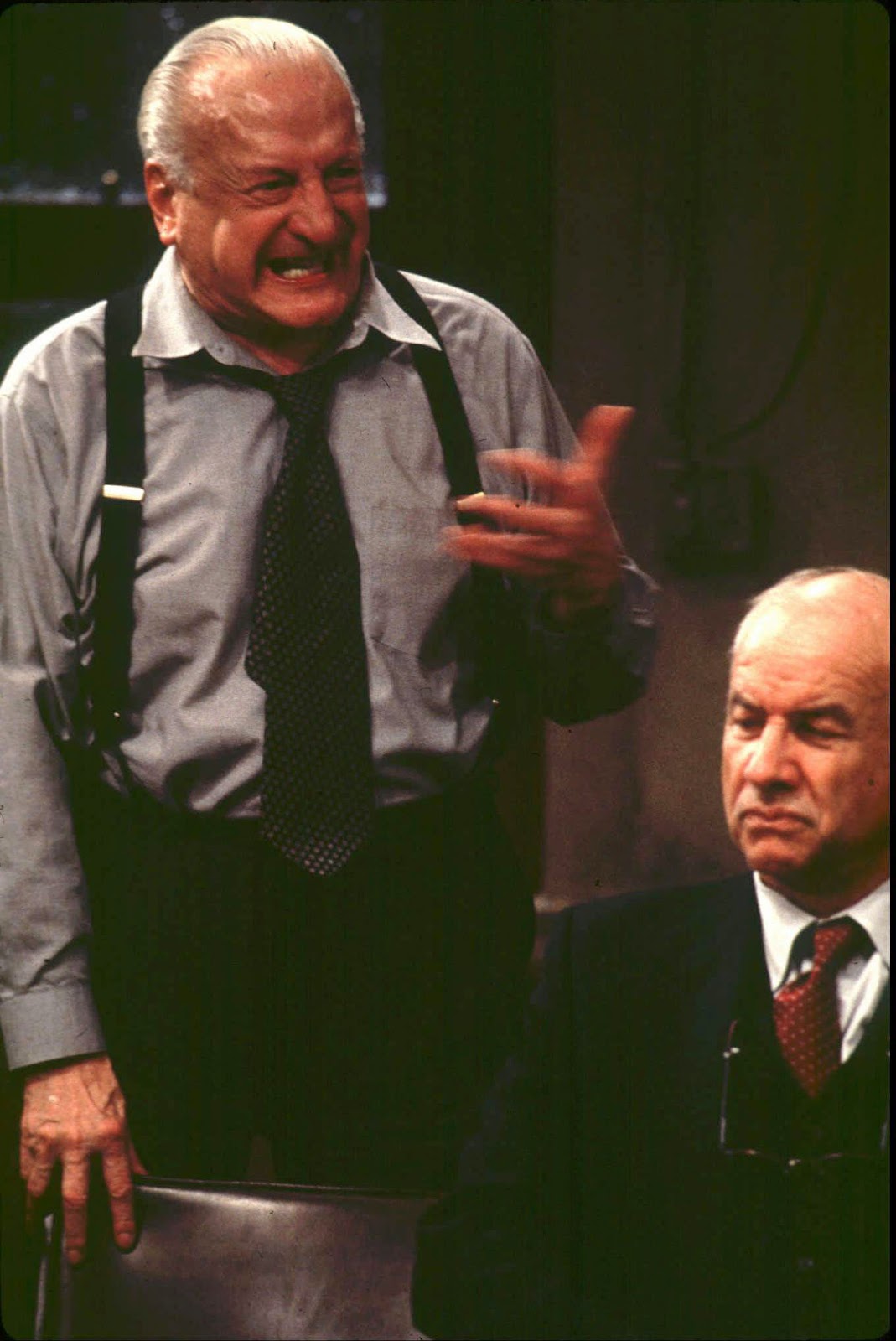 Description: A man in a tie and suspenders standing next to another man in a suit and tie.
