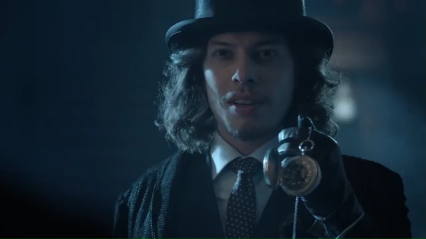 Description: A man in a top hat holding a gun in a dark room with a green border around it and a green border around the image.