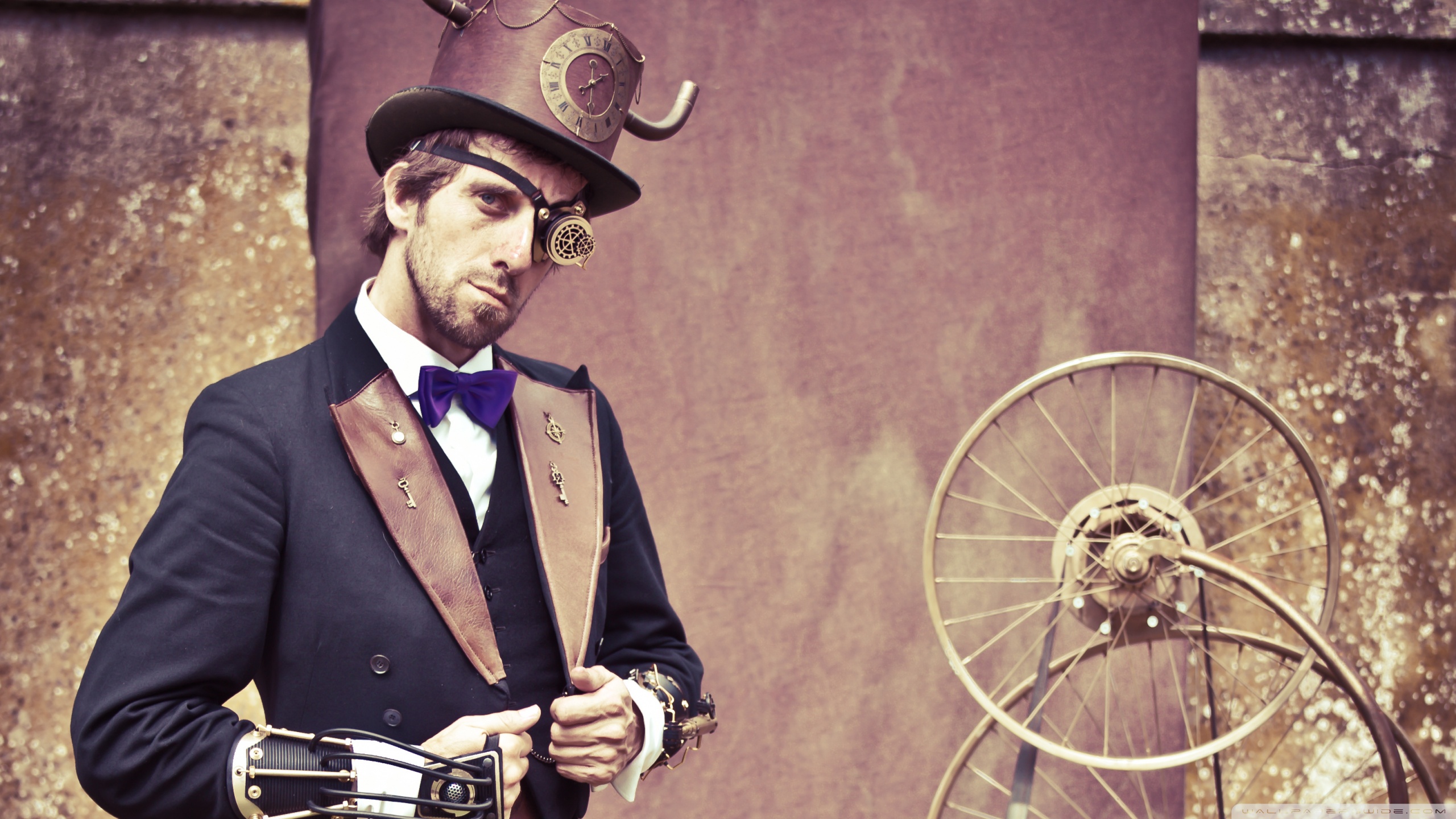 Description: A man in a top hat and suit with a bicycle in front of a wall with a wheel on it.