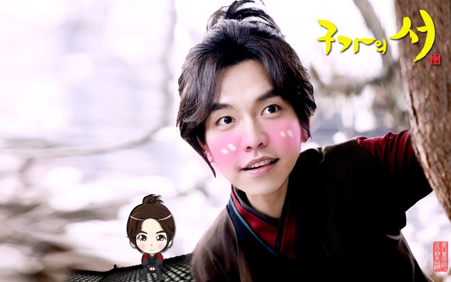 Description: A man standing next to a tree with a pink face paint on his face and a cartoon character behind him.