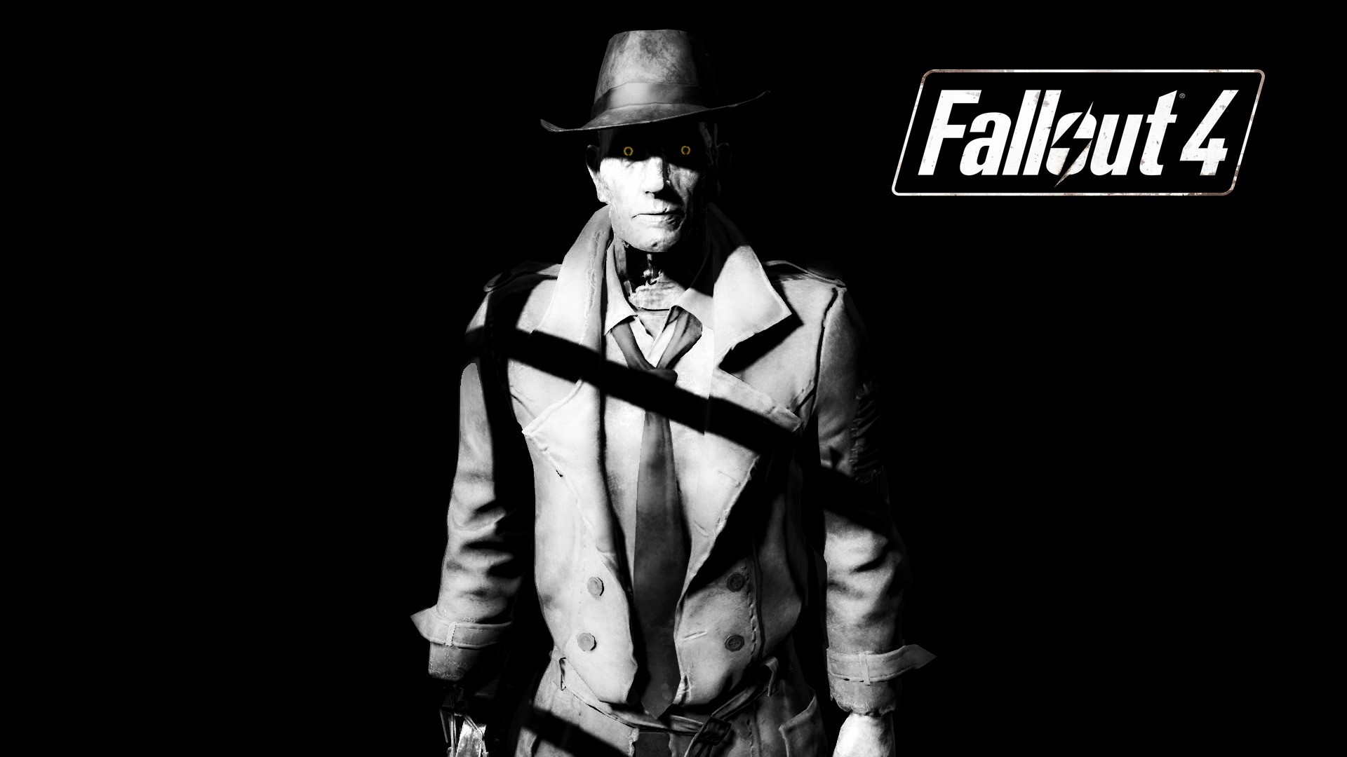 Description: A man in a trench coat and hat with a knife in his hand and a sign that says fallout 4.