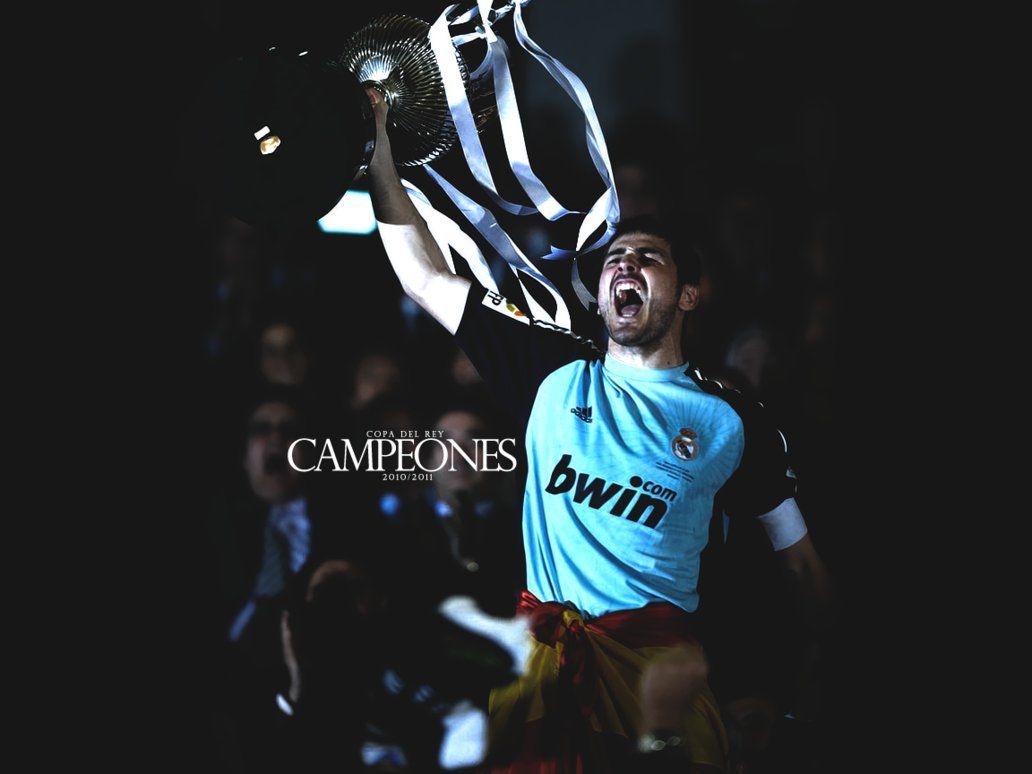Description: A man holding a trophy in his hands while wearing a blue shirt and a red and white tie with the words campeones.