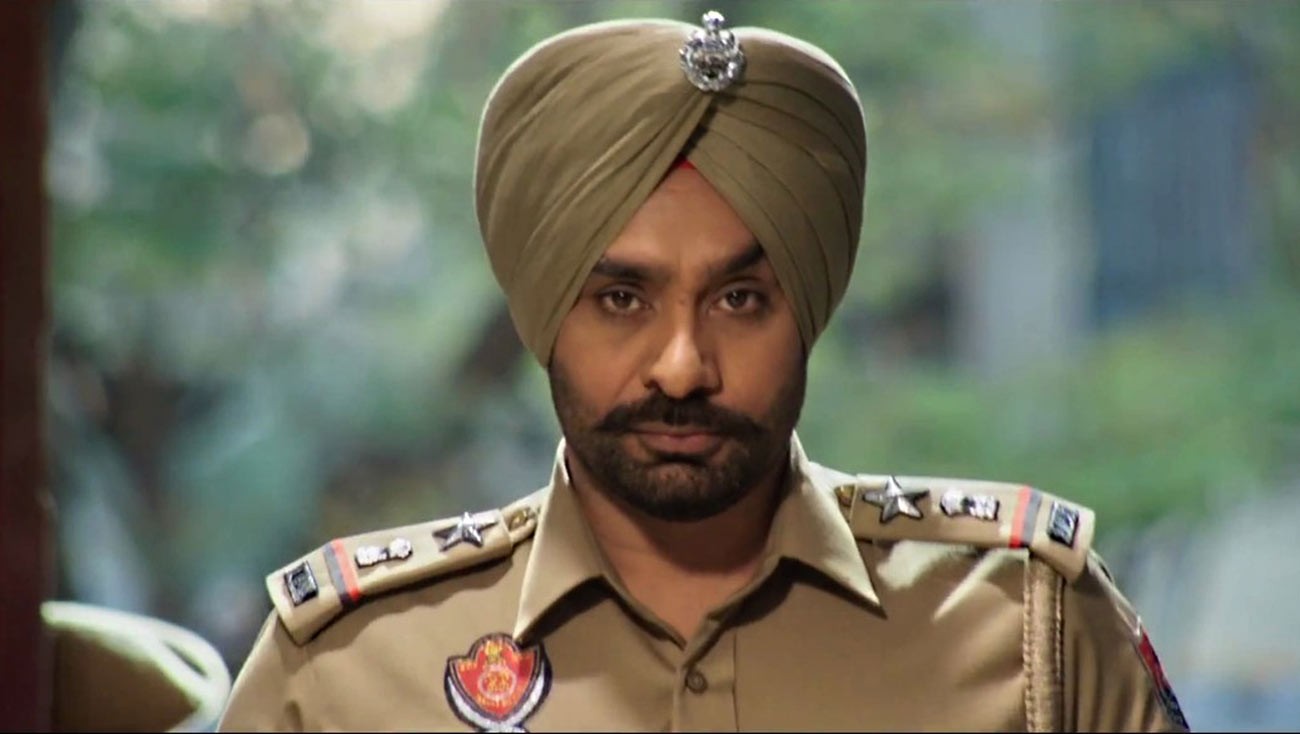 Description: A man in a turban looks at the camera while wearing a uniform with a badge on it.