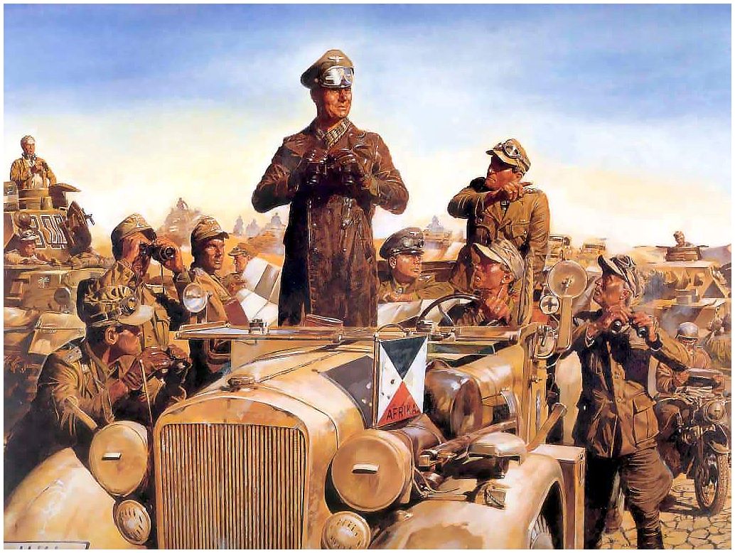 Description: A painting of a man standing in front of a group of men in uniform and a car with a flag on it.