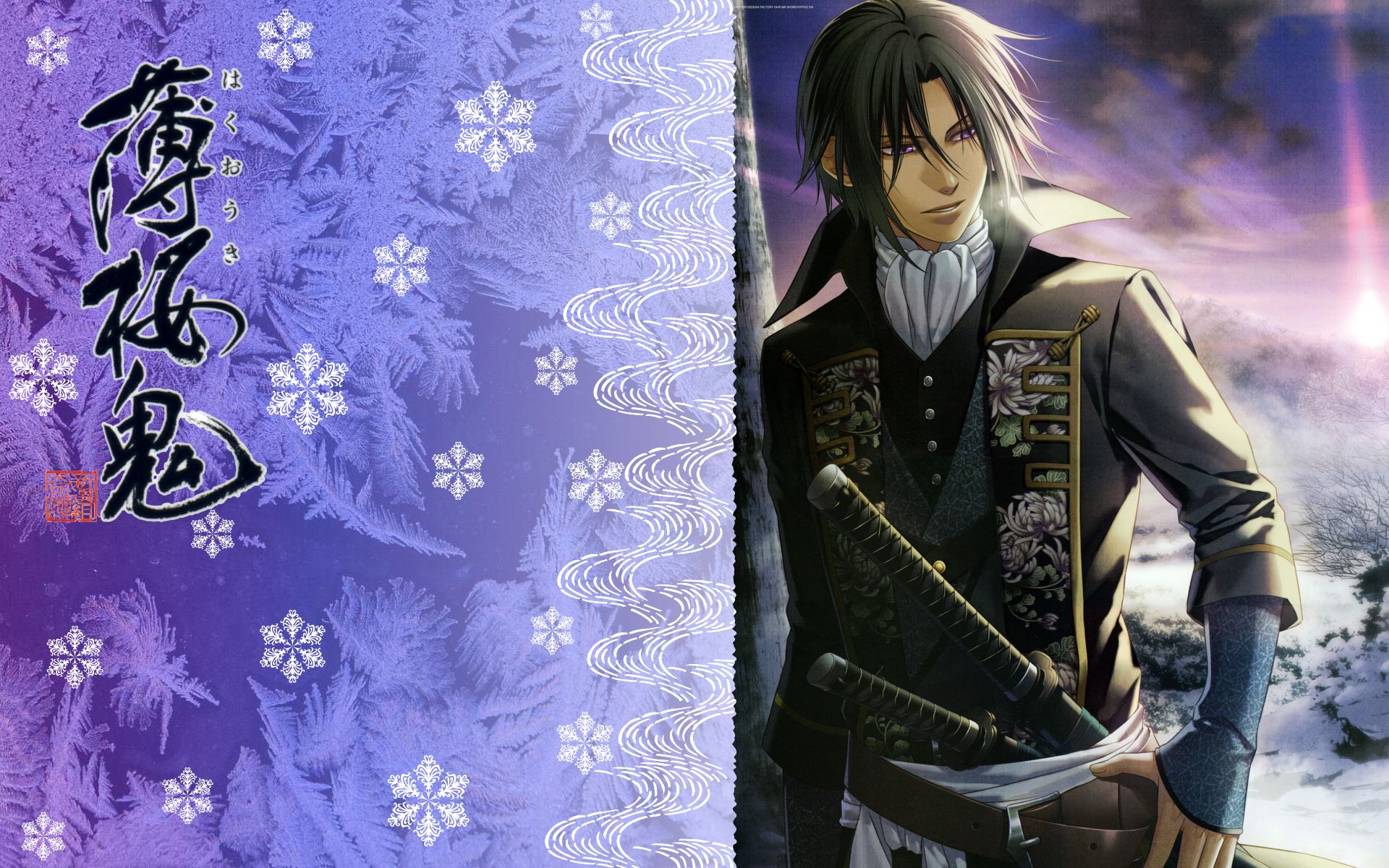 Description: A man in a uniform standing next to a snow covered landscape with a sword in his hand and a snowflake background.