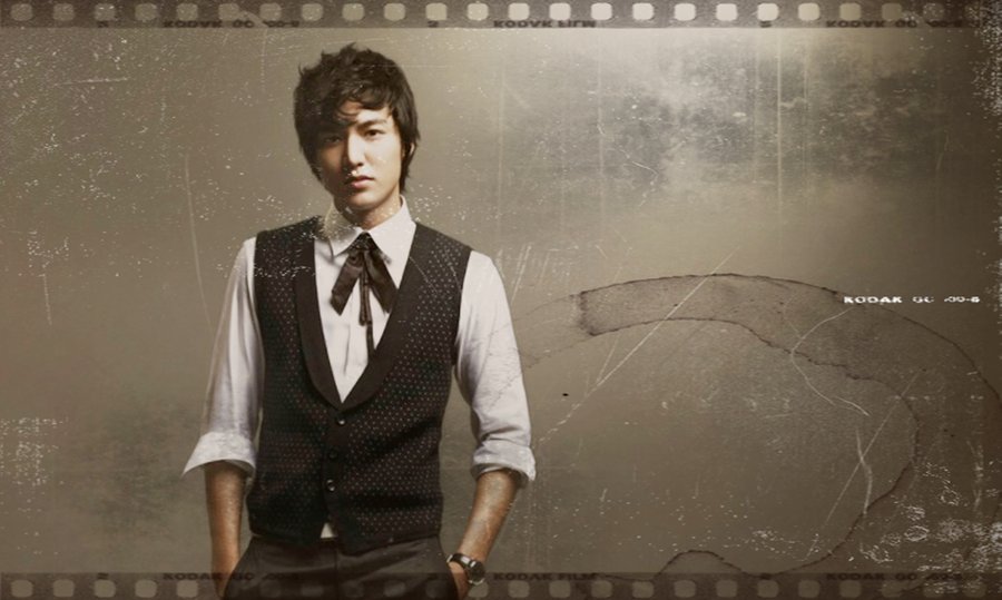 Description: A man in a vest and tie standing in front of a wall with a film strip around him and a camera.