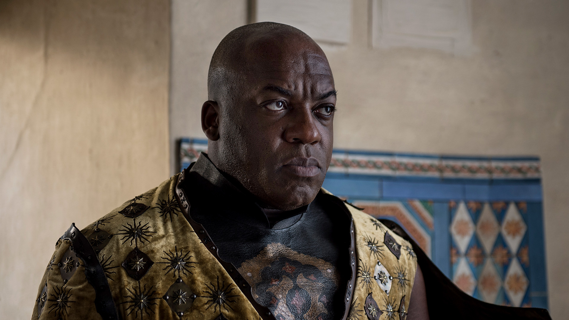 Description: A man in a vest and a wall with a tile pattern on it and a blue and orange wall.