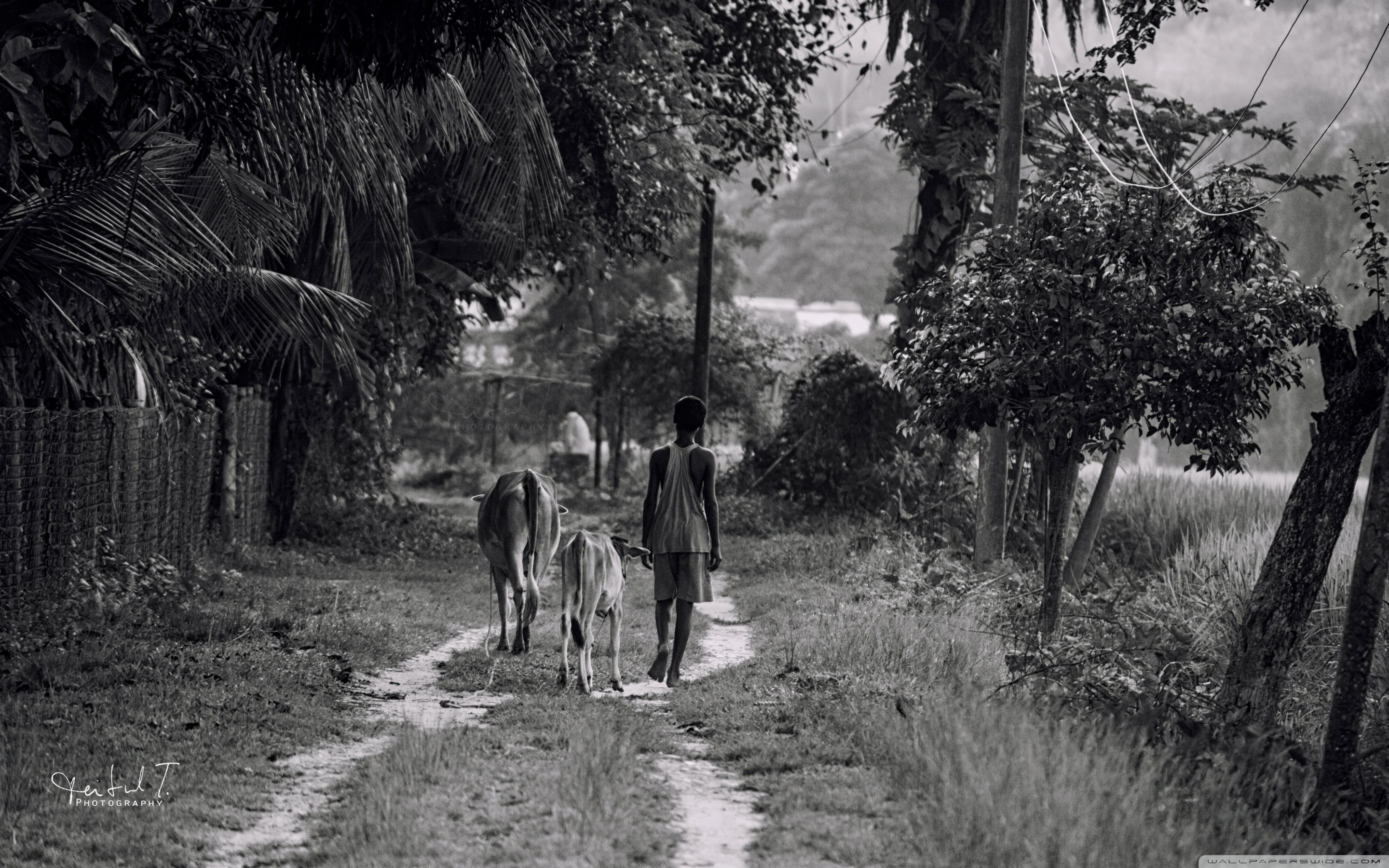 Description: A man walking two dogs down a dirt road in the woods on a cloudy day with trees and grass.