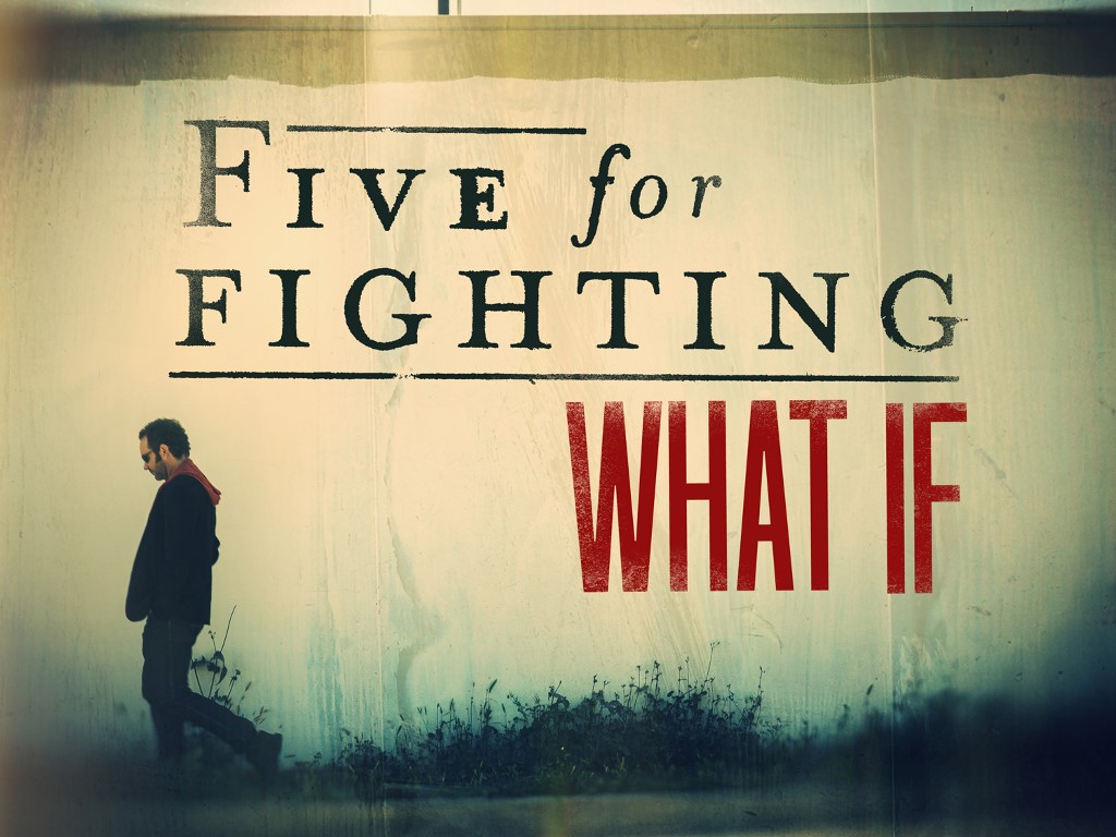 Description: A man walking past a sign that says five for fighting whatie on it's side wall.