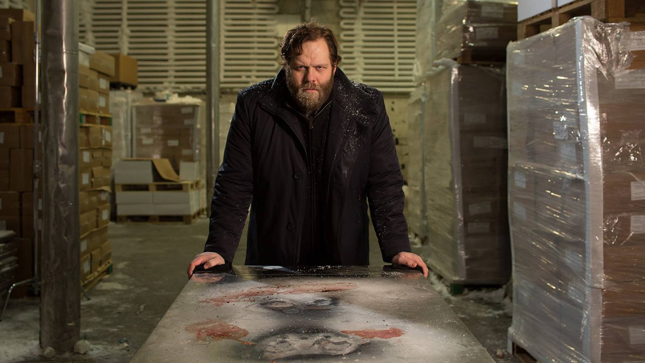 Description: A man standing in a warehouse with a table covered in ice and a bunch of boxes behind him and a large amount of ice on the floor.