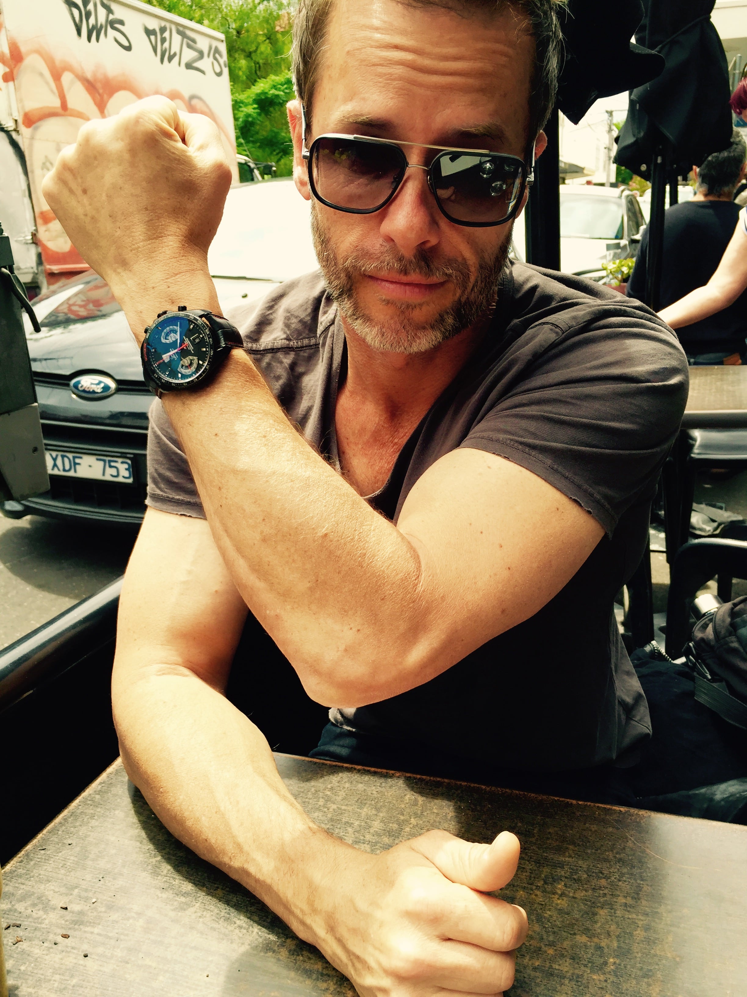 Description: A man with a watch on his wrist sitting at a table in a restaurant with a graffiti covered wall.