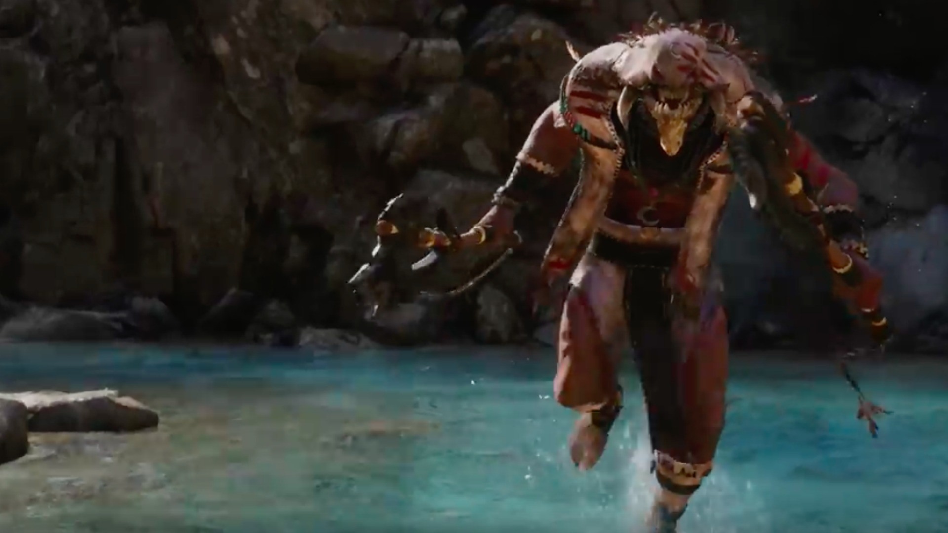 Description: A man in a body of water with a large animal on his back and arms outstretched.