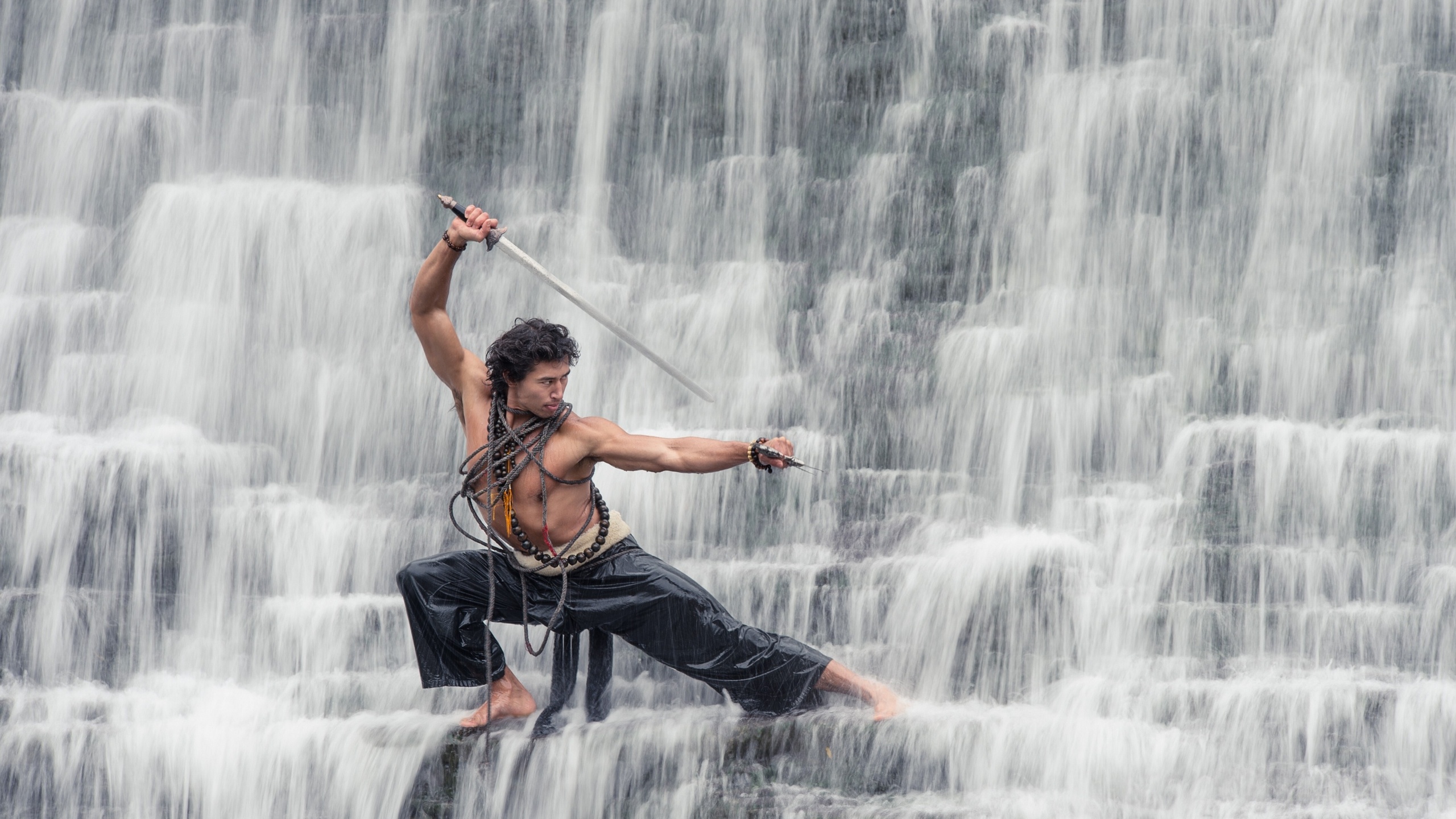 Description: A man in a costume is standing in front of a waterfall with a sword in his hand and a sword in his other hand.