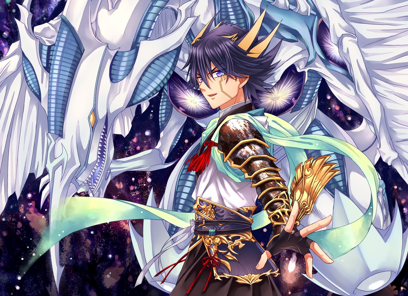 Description: A man in a white and blue outfit holding a sword and a dragon behind him with wings flying above him.