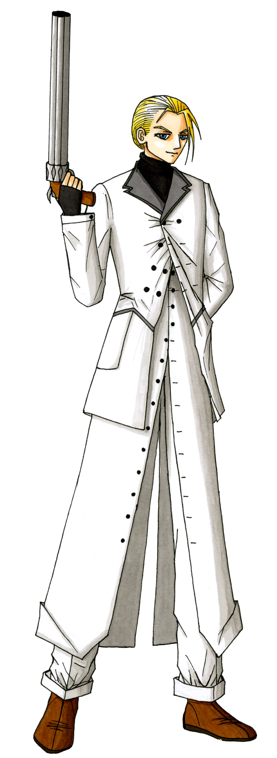Description: A man in a white coat holding a gun and a cigarette in his hand.