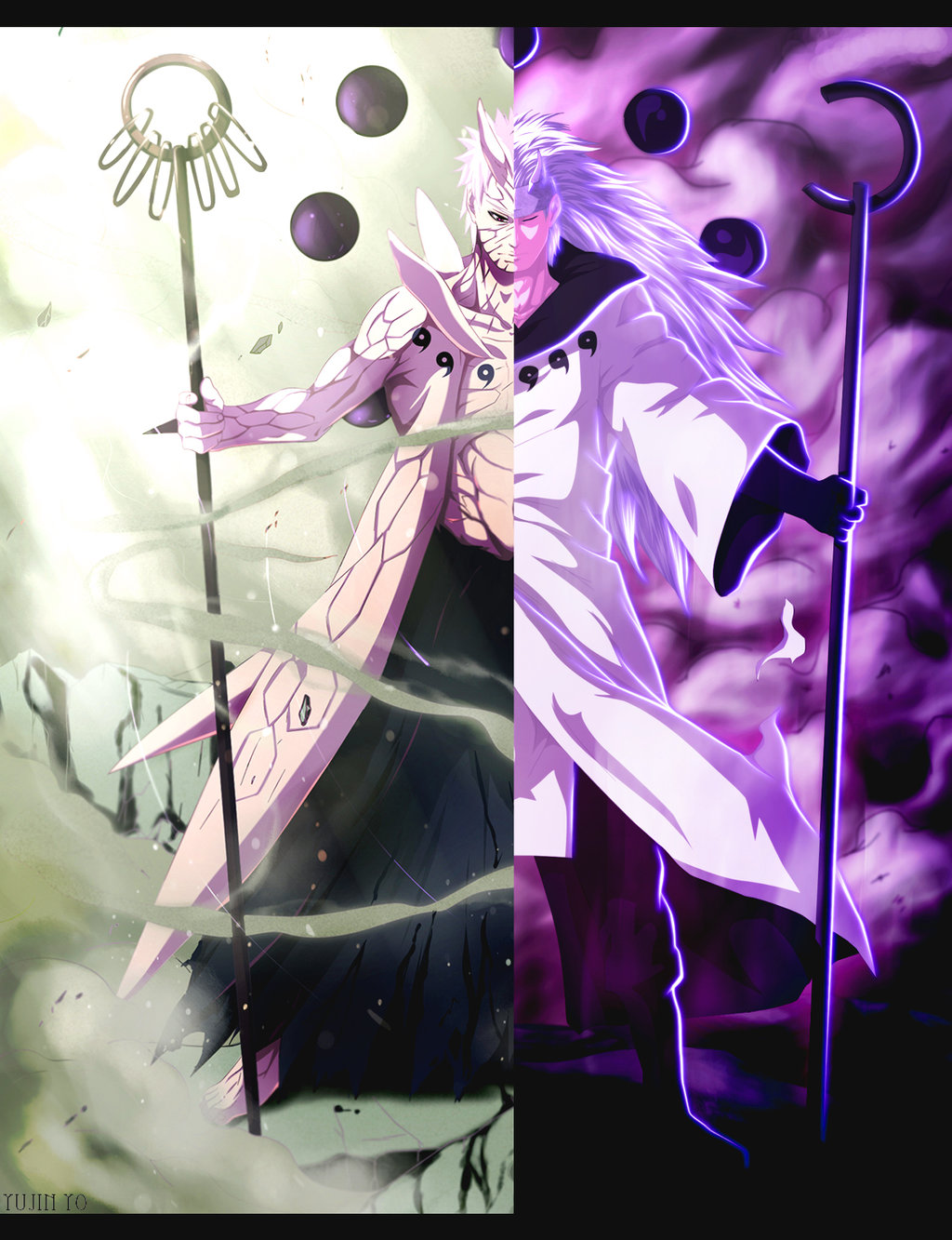 Description: A man in a white coat holding a staff and a purple umbrella in front of a purple background with a black and white design.