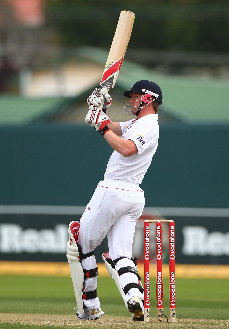 Description: A man in white playing a game of cricket on a field of grass and grass with a bat in his hand.