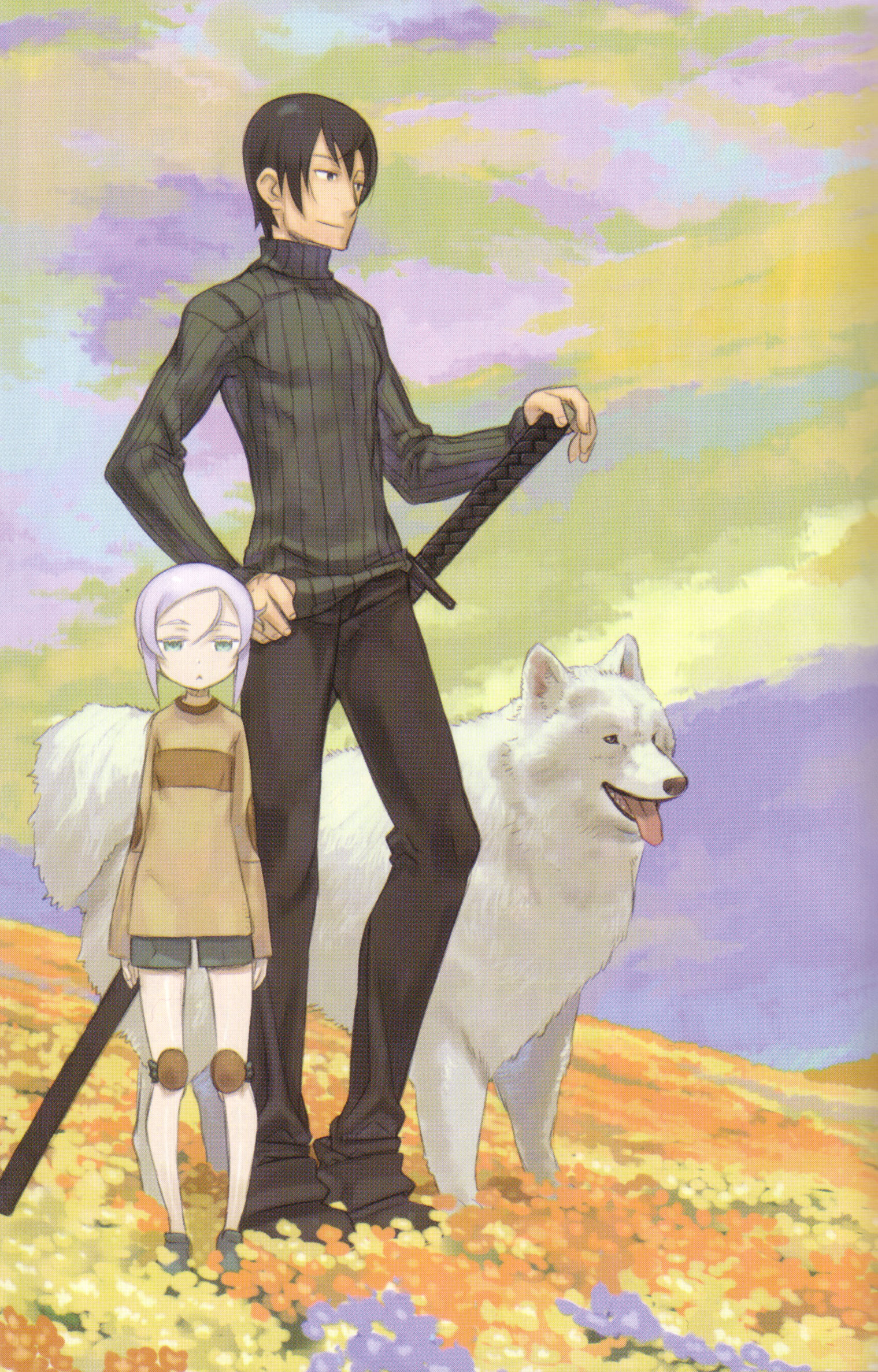 Description: A man standing next to a white dog on top of a field of flowers with a sword in his hand.