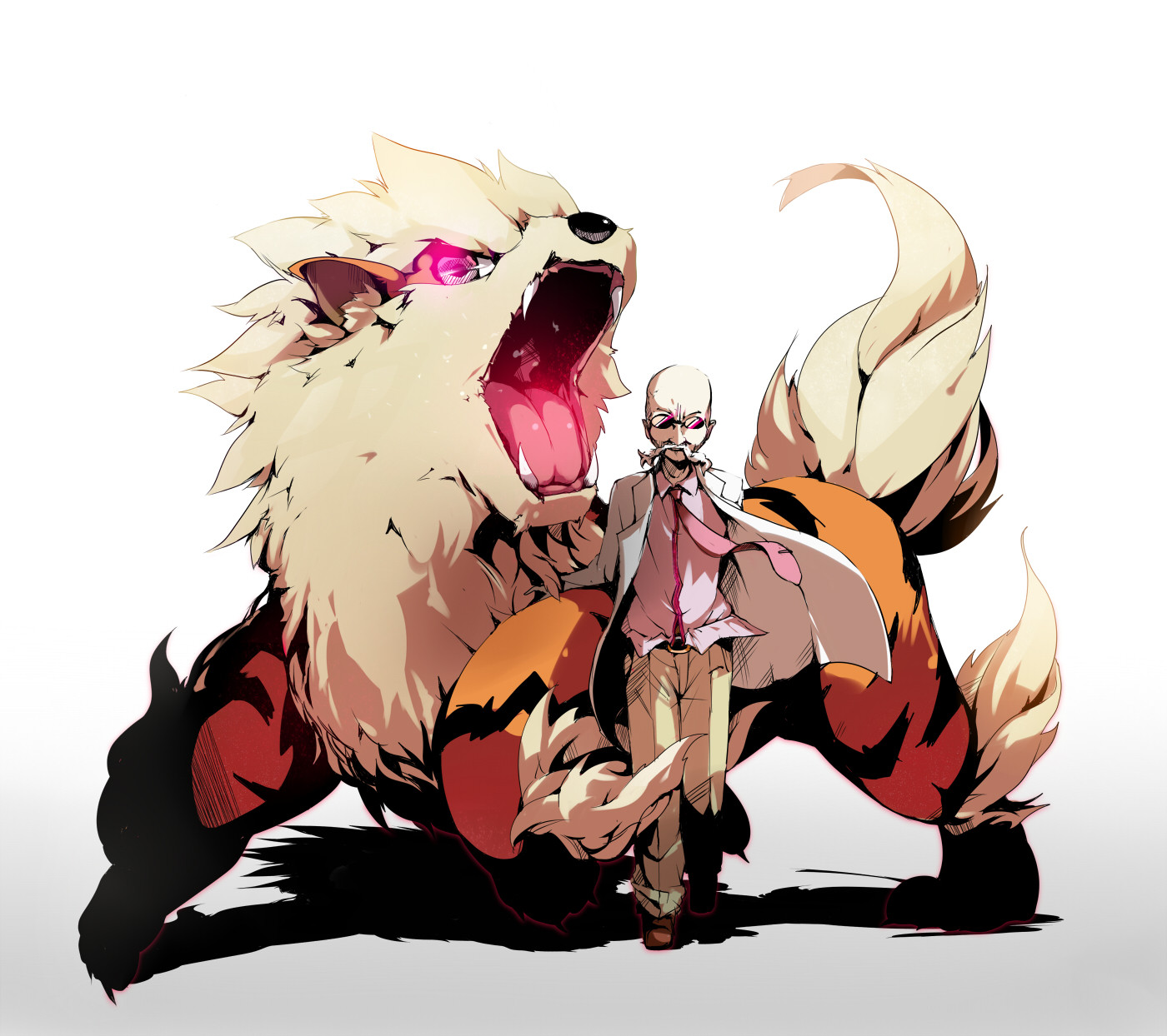 Description: A man standing next to a white dog with its mouth open and a person holding a sword in front of him.