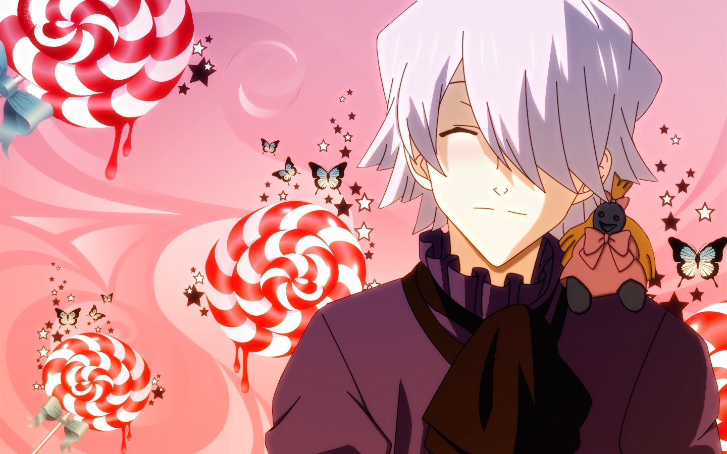 Description: A man with white hair and a purple outfit is standing in front of candy canes and lollipops.