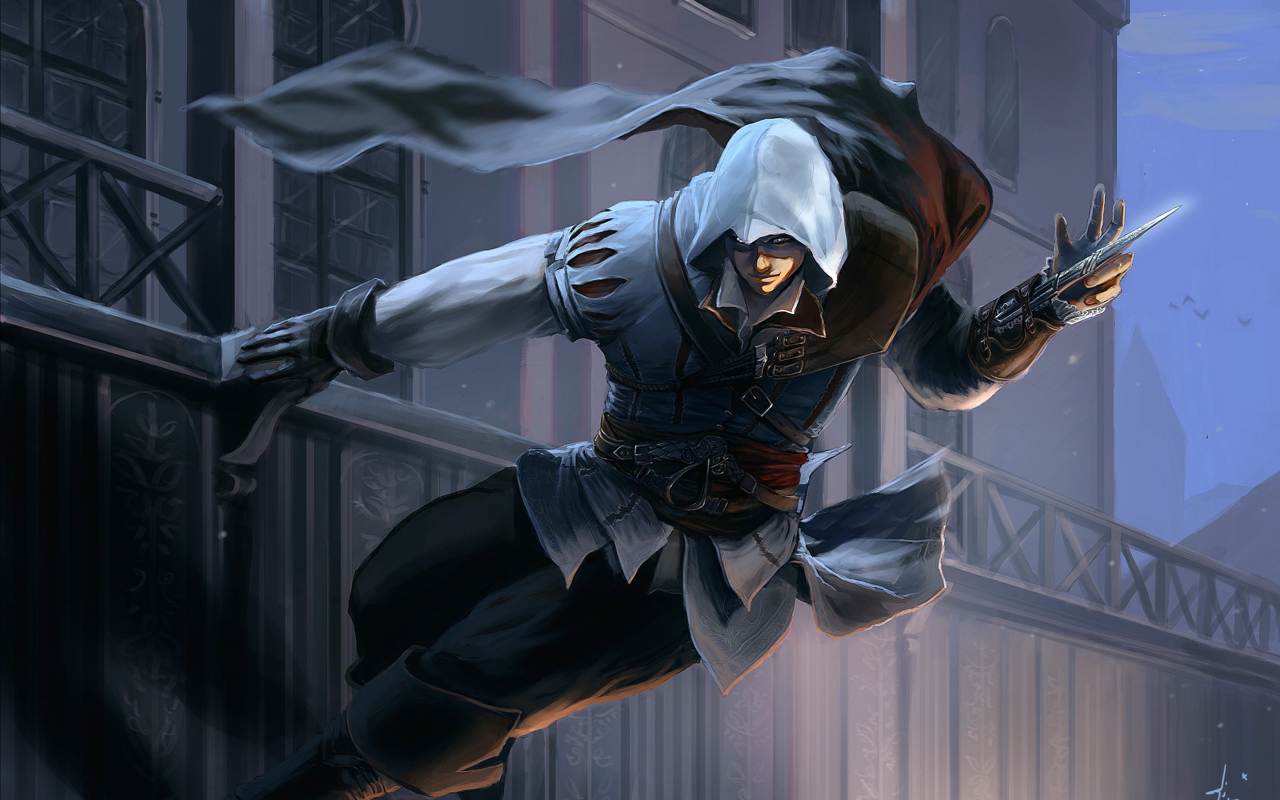Description: A man in a white outfit is flying through the air with his arms outstretched and a sword in his hand.