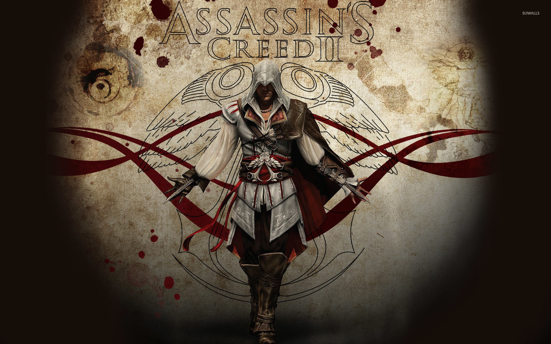 Description: A man in a white outfit with a sword and a banner behind him that says.