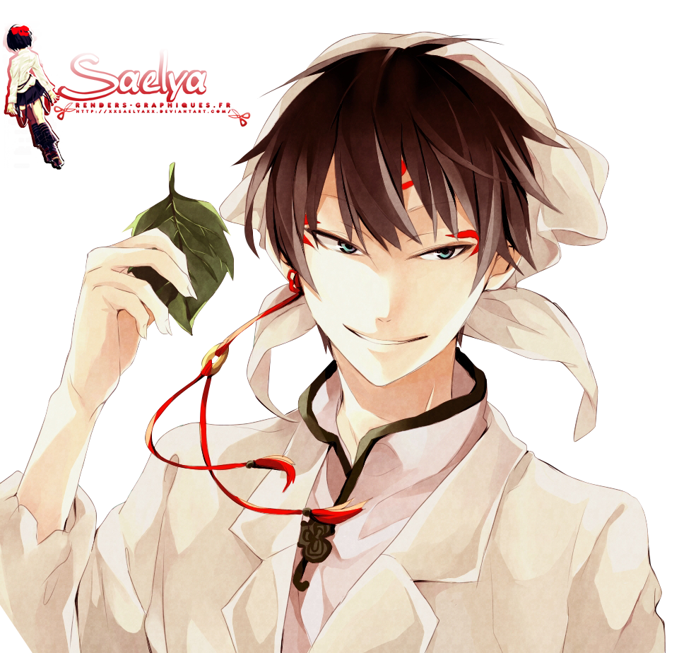 Description: A man in a white shirt holding a green leaf in his hand and a red string around his neck.