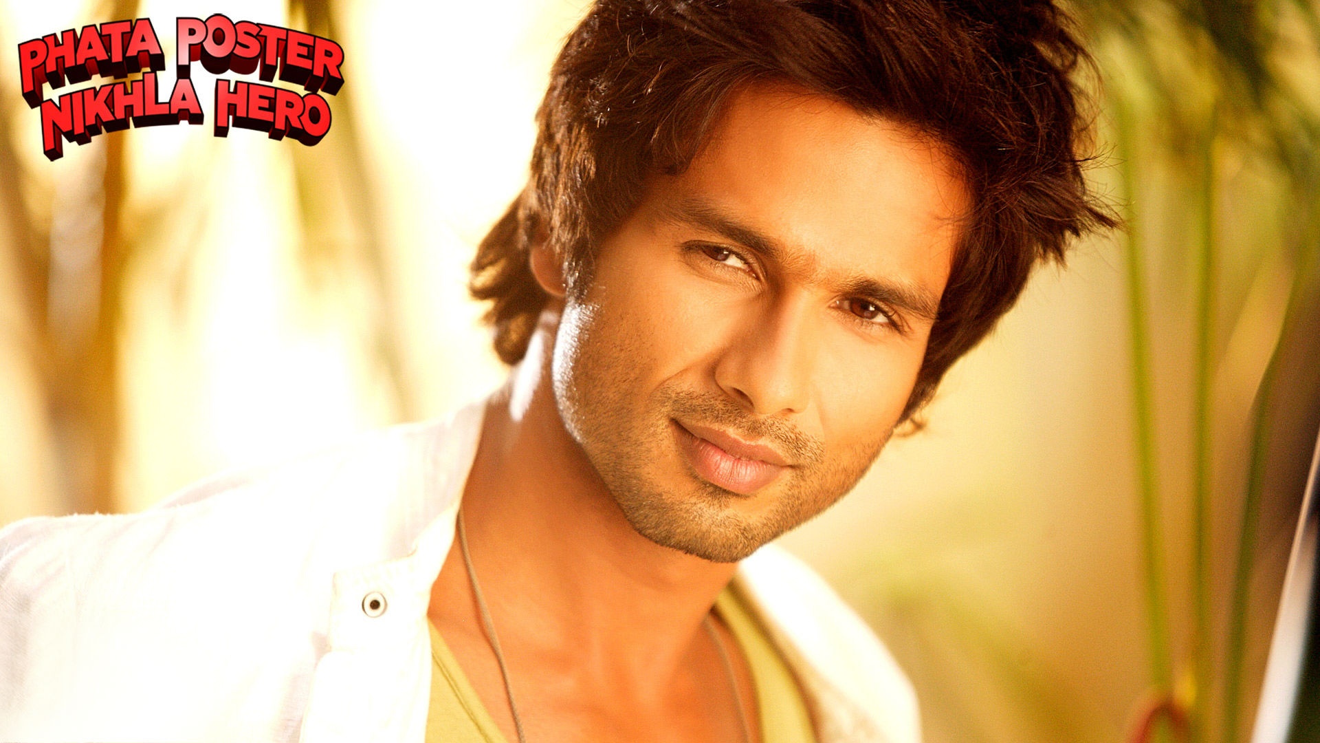 Description: A man with a white shirt and a necklace on his neck and a plant in the background with a red sign that says.