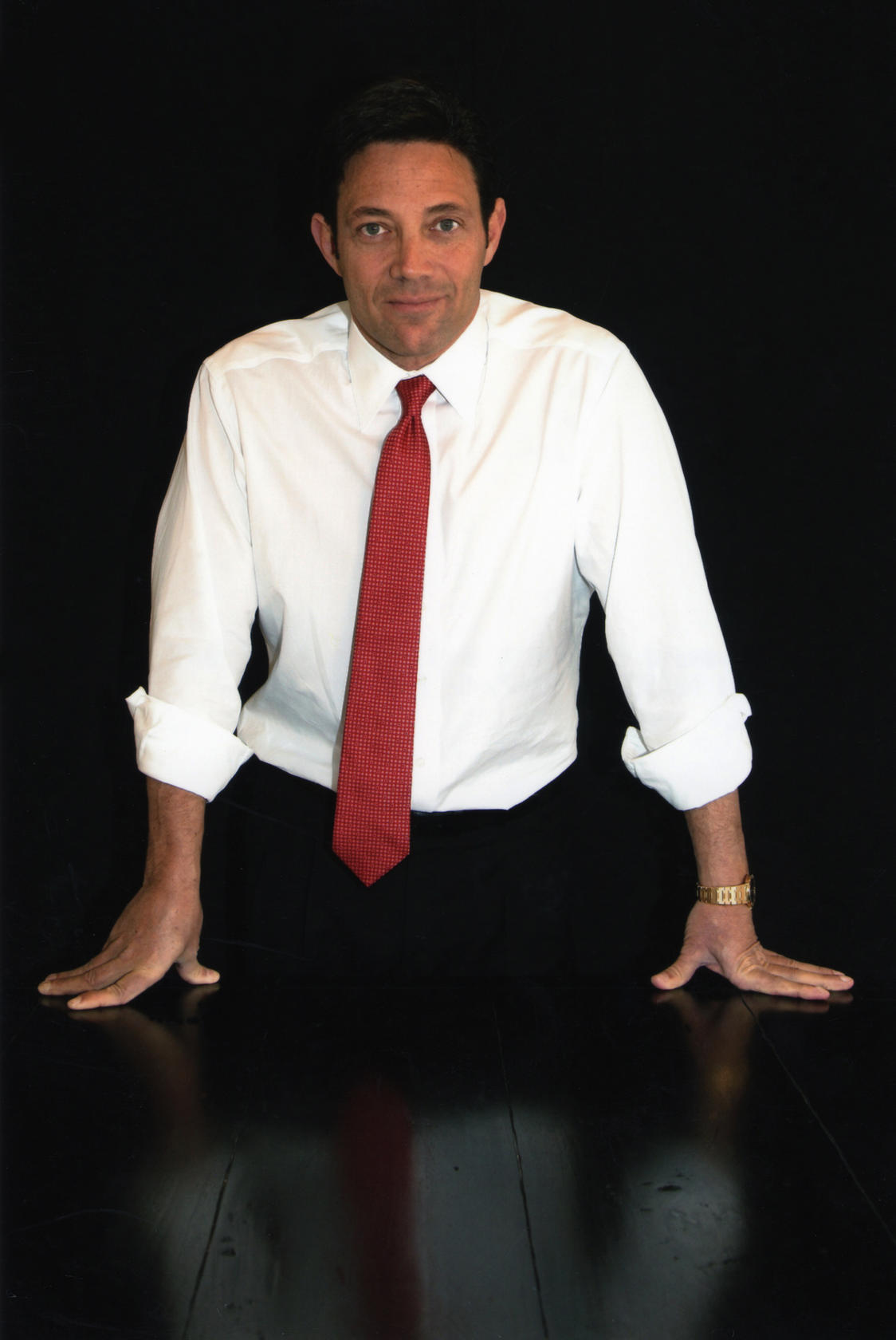 Description: A man in a white shirt and red tie posing for a picture with his hands out in front of him.