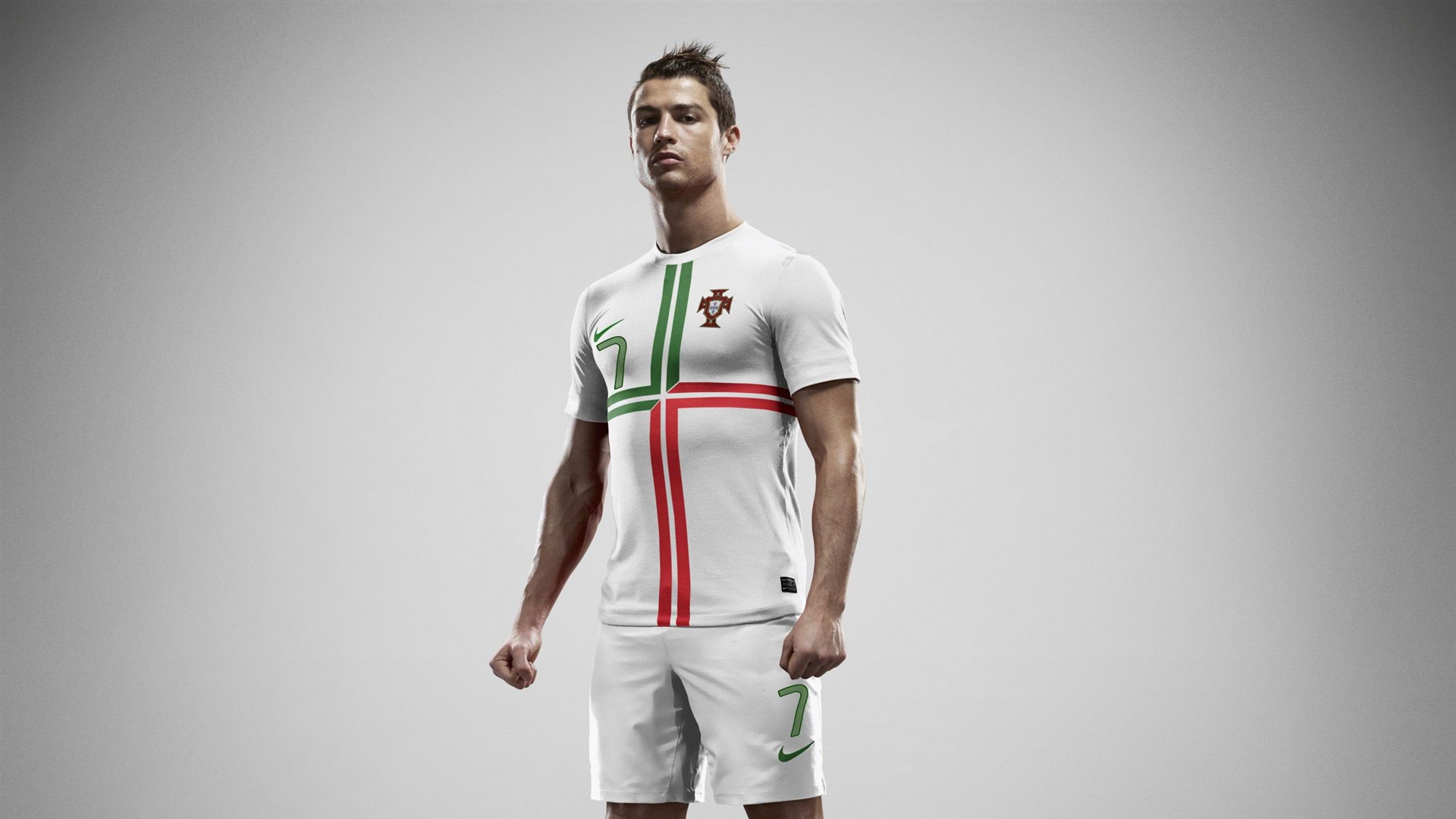 Description: A man in a white shirt and shorts standing in a studio photo with a gray background and a white background.