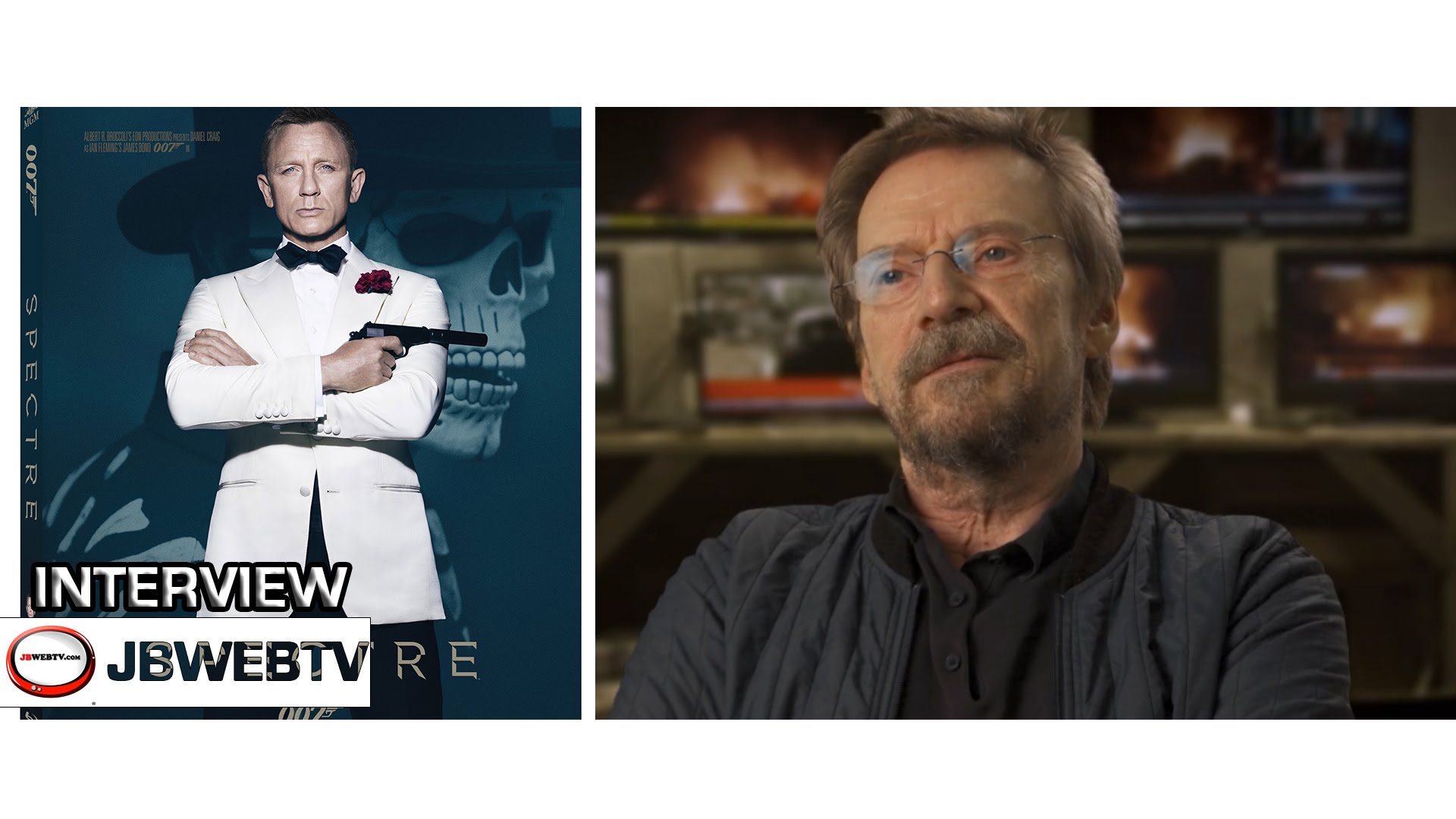 Description: A man in a white suit and a movie poster of a man in a white suit and a movie poster of a skeleton.