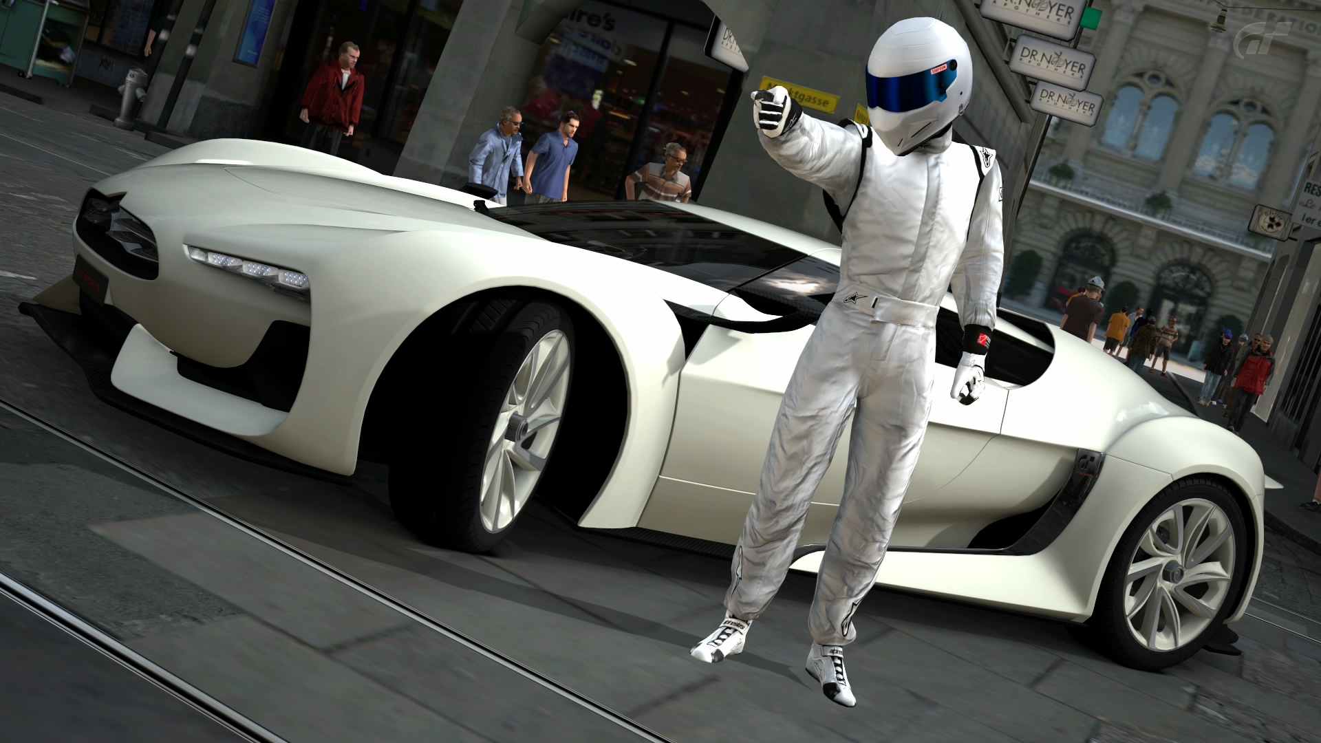 Description: A man in a white suit standing next to a white car on a street with people standing around it.