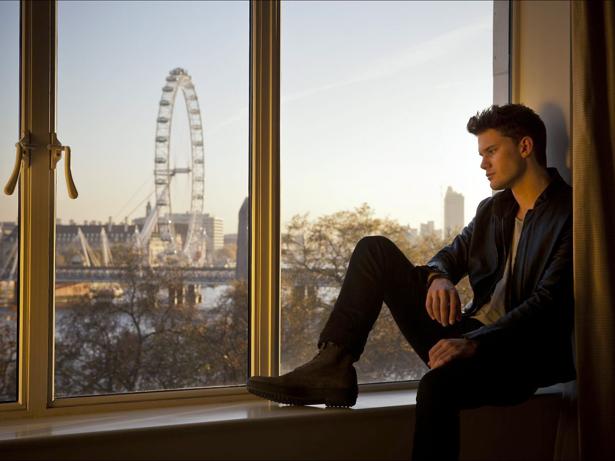 Description: A man sitting on a window sill looking out at the city skyline and ferris wheel in the distance.